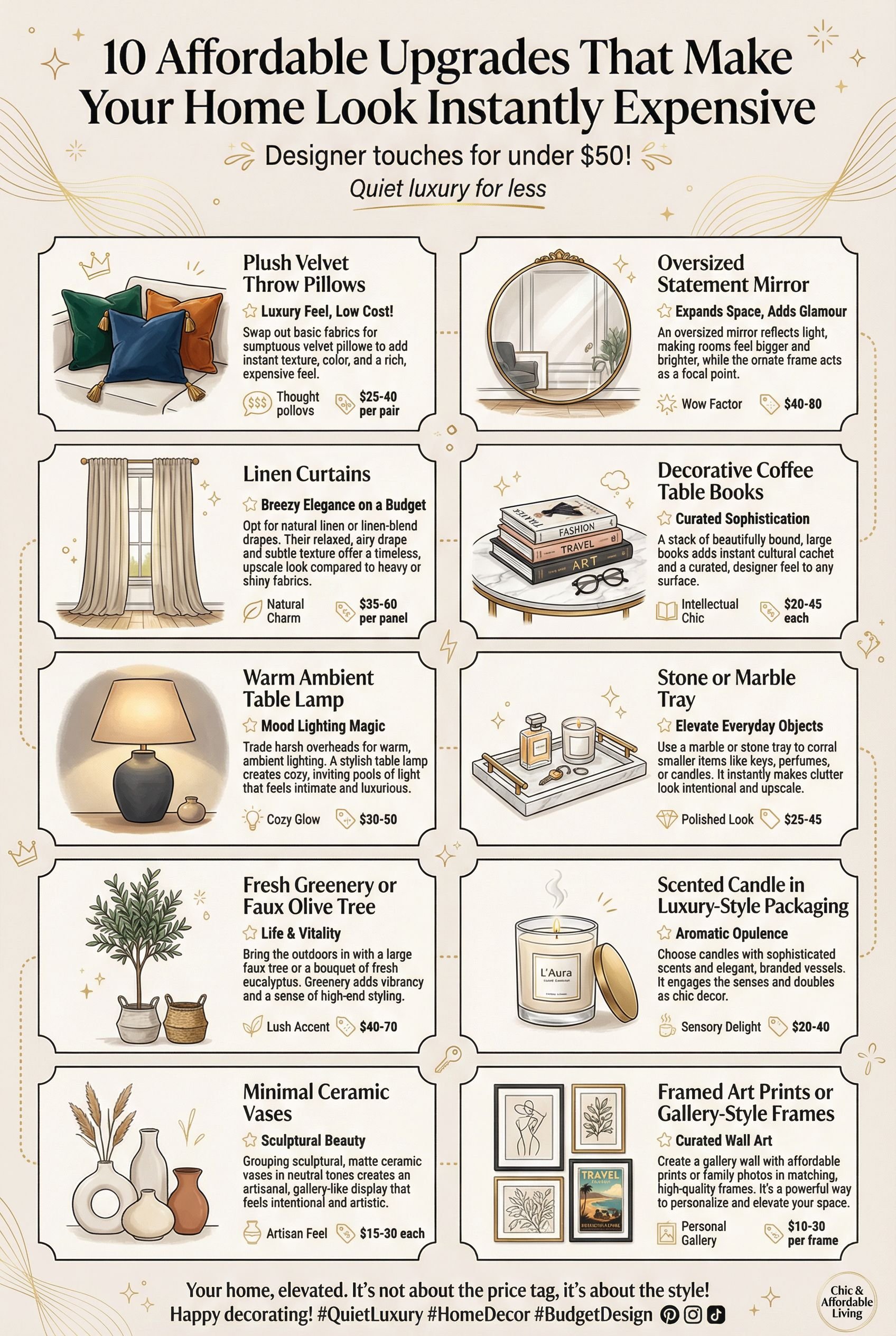 Designer interiors have a certain look. Everything feels intentional, layered, and luxurious. The good news is that achieving this aesthetic does not require a designer budget. These ten upgrades, all under $80 and most under $50, can transform any room from basic to beautiful. The secret lies not in how much you spend but in knowing which details create the biggest visual impact.