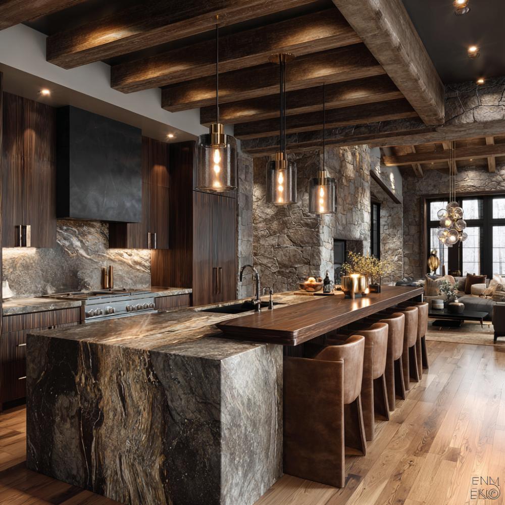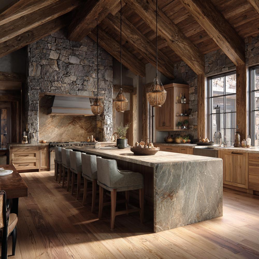Stone Waterfall Island Anchors Rustic Modern Mountain Retreat
