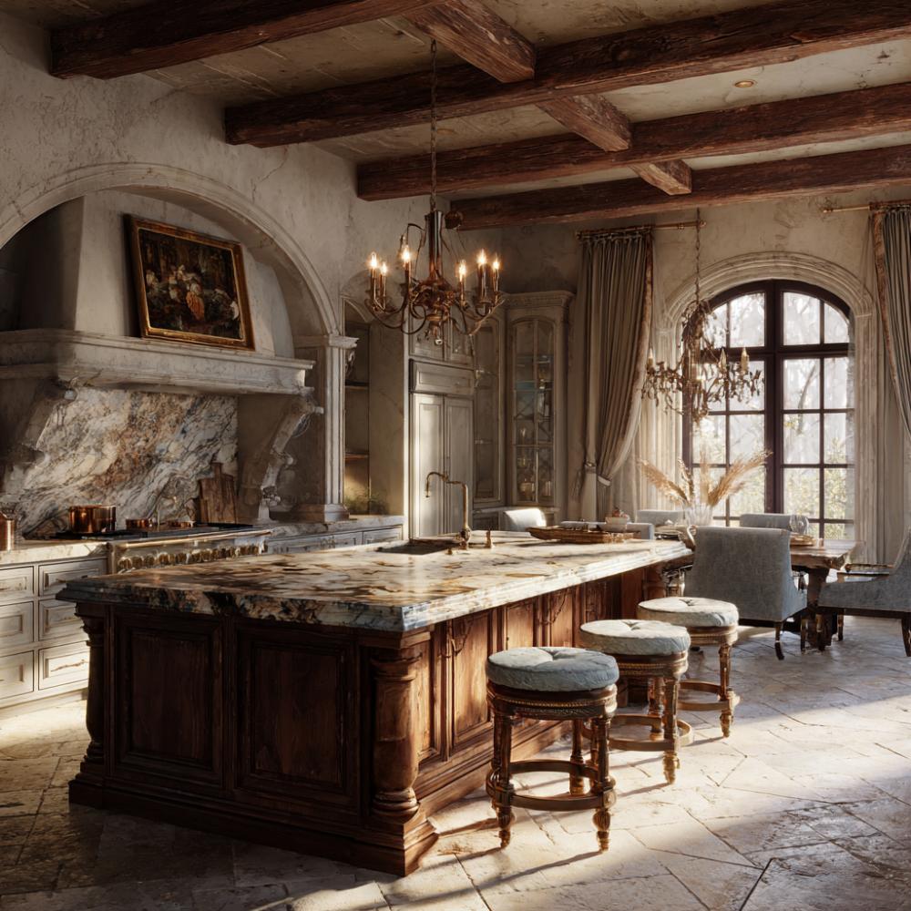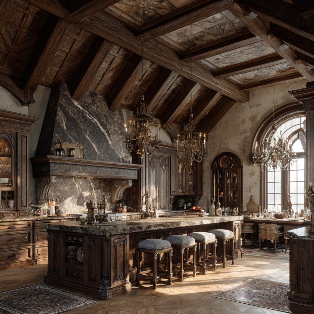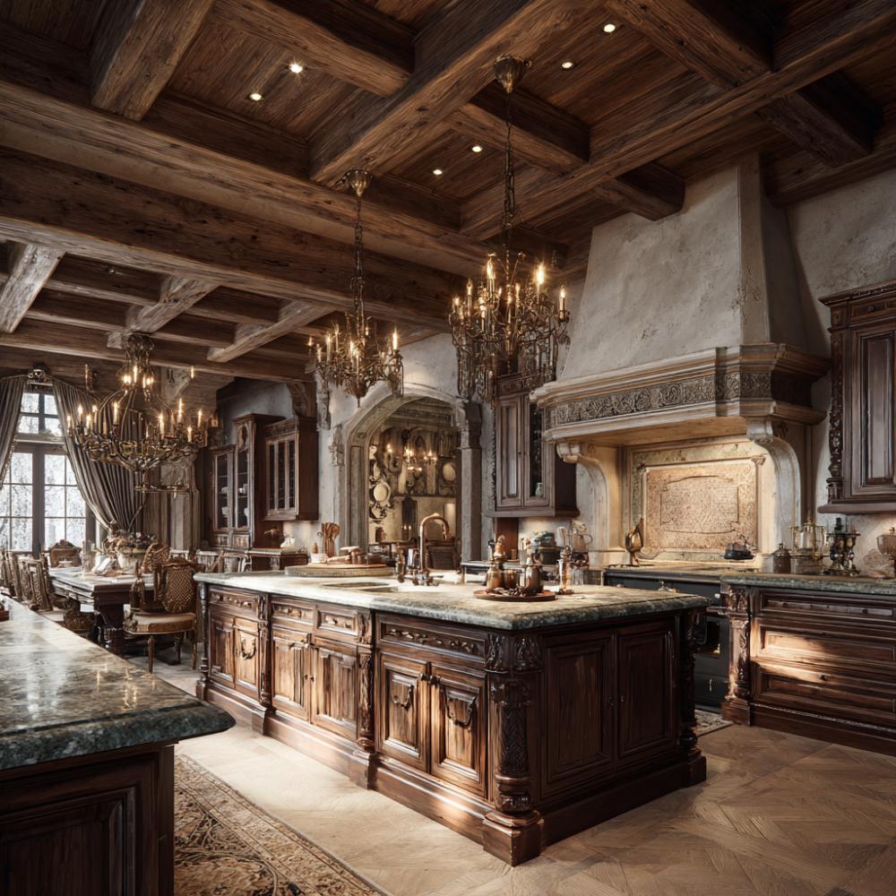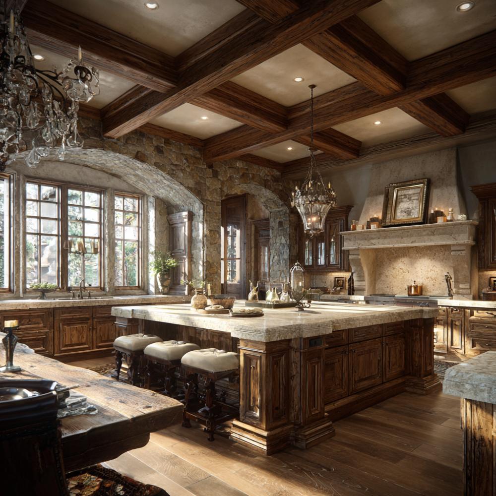 Soaring coffered ceilings with reclaimed wood beams create cathedral-like drama above this opulent kitchen sanctuary. Rich walnut cabinetry with ornate carved details surrounds a massive marble-topped island, while crystal chandeliers cast warm light across limestone walls. An arched stone range hood anchors the cooking zone, blending Old World craftsmanship with modern culinary luxury for entertaining on a grand scale.