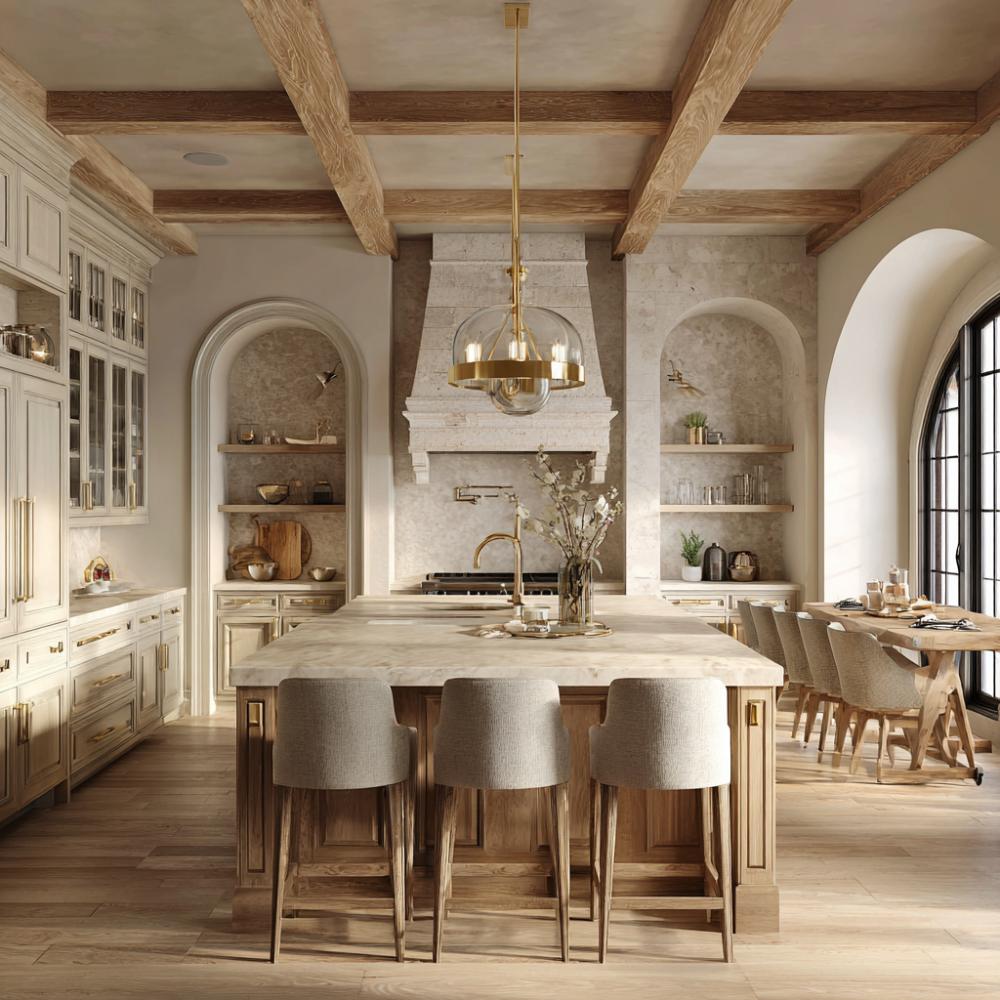 Exposed Beam Elegance Meets Mediterranean-Inspired Stone Archways
