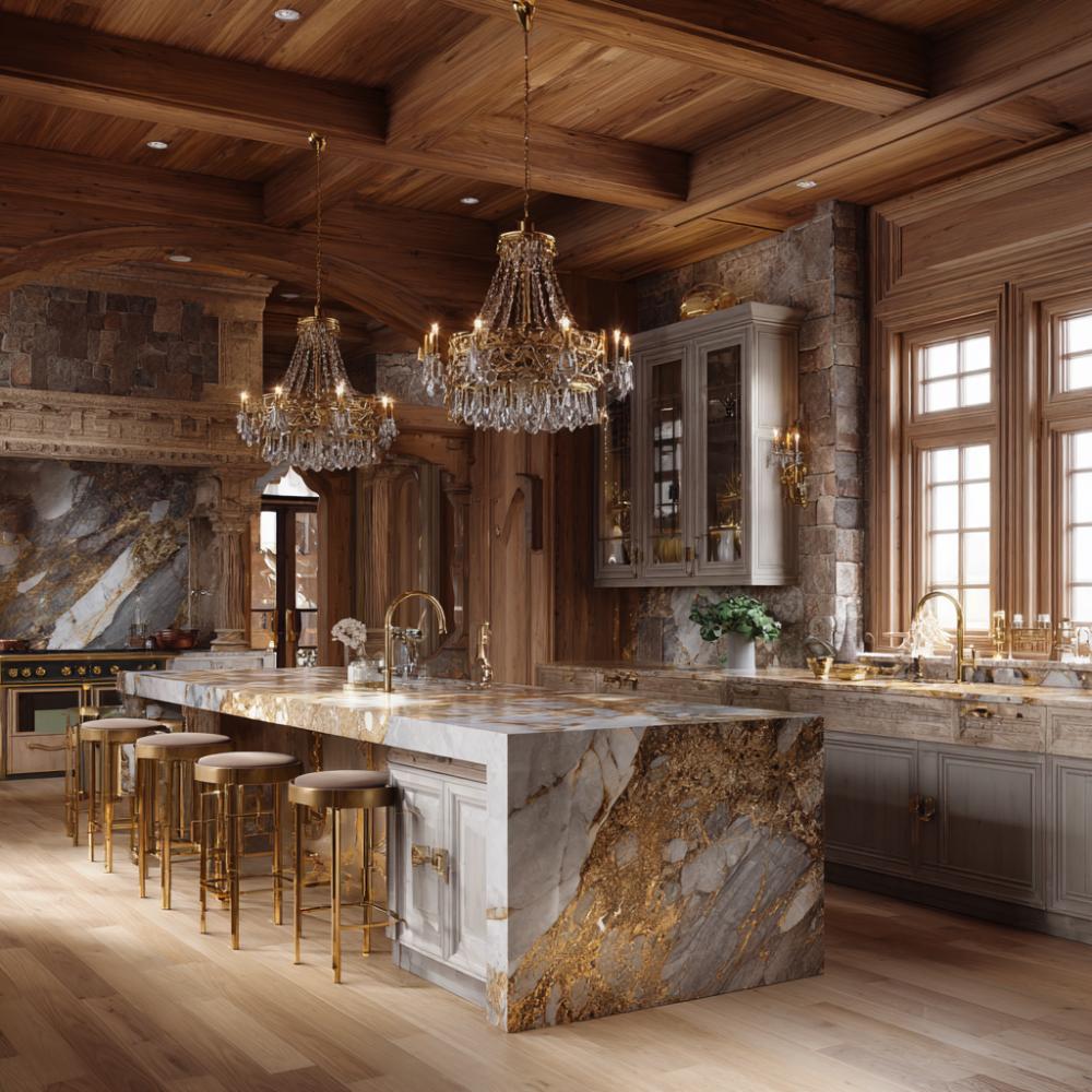 We love the warmth of chalet kitchens, but we also wanted a little glamour. So we uploaded our inspiration to AI and gave it a generous $100K budget to play with. What came back surprised us. From rich wood beams and dramatic islands to layered stone, brass accents, and cozy alpine textures, these 40 kitchens feel indulgent, inviting, and anything but ordinary. The results are bold, beautiful, and seriously eye-opening.