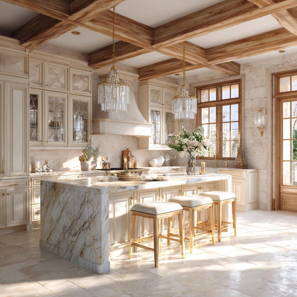 Coffered wood ceilings create architectural drama above this sophisticated kitchen where cream cabinetry with geometric glass inserts showcases fine dishware. The stunning marble waterfall island anchors the space with bold veining, while crystal chandeliers cast elegant light throughout. Brass hardware and warm wood window frames add luxurious touches that complement the neutral stone flooring and classical design elements.