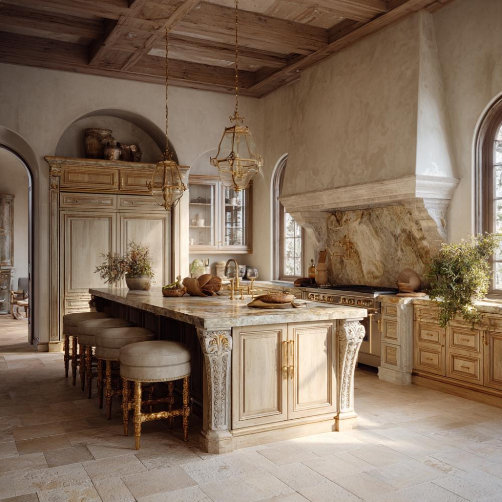 Warm honey oak cabinetry creates stunning contrast against cream limestone walls in this opulent Mediterranean-inspired design. An intricately carved stone range hood commands attention as the roomโs focal point, while exposed wooden ceiling beams add rustic authenticity. Ornate brass pendant lanterns illuminate a marble-topped island surrounded by gilded bar stools, perfectly balancing Old World craftsmanship with modern luxury amenities.