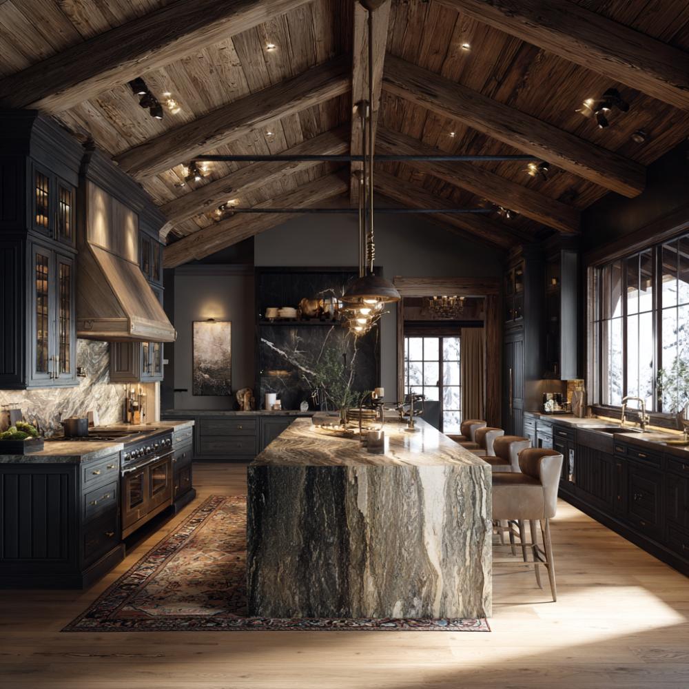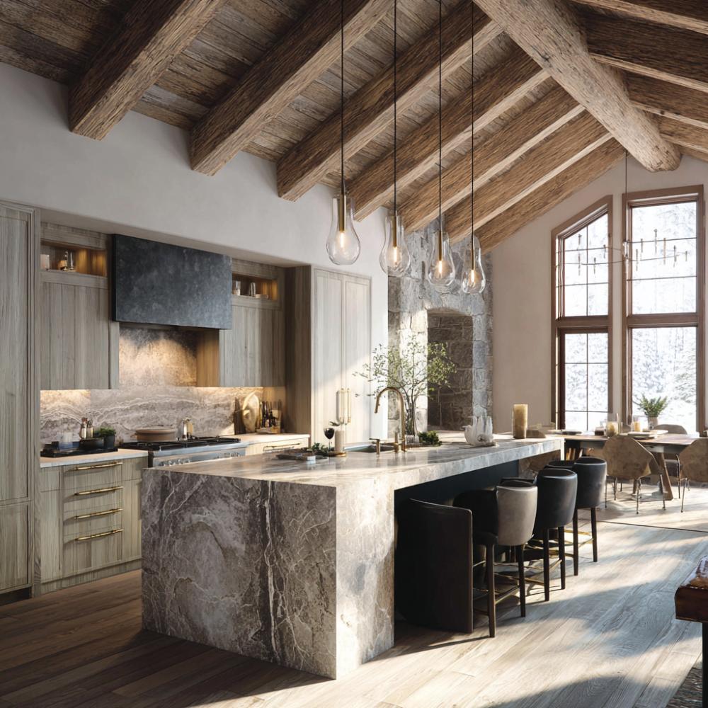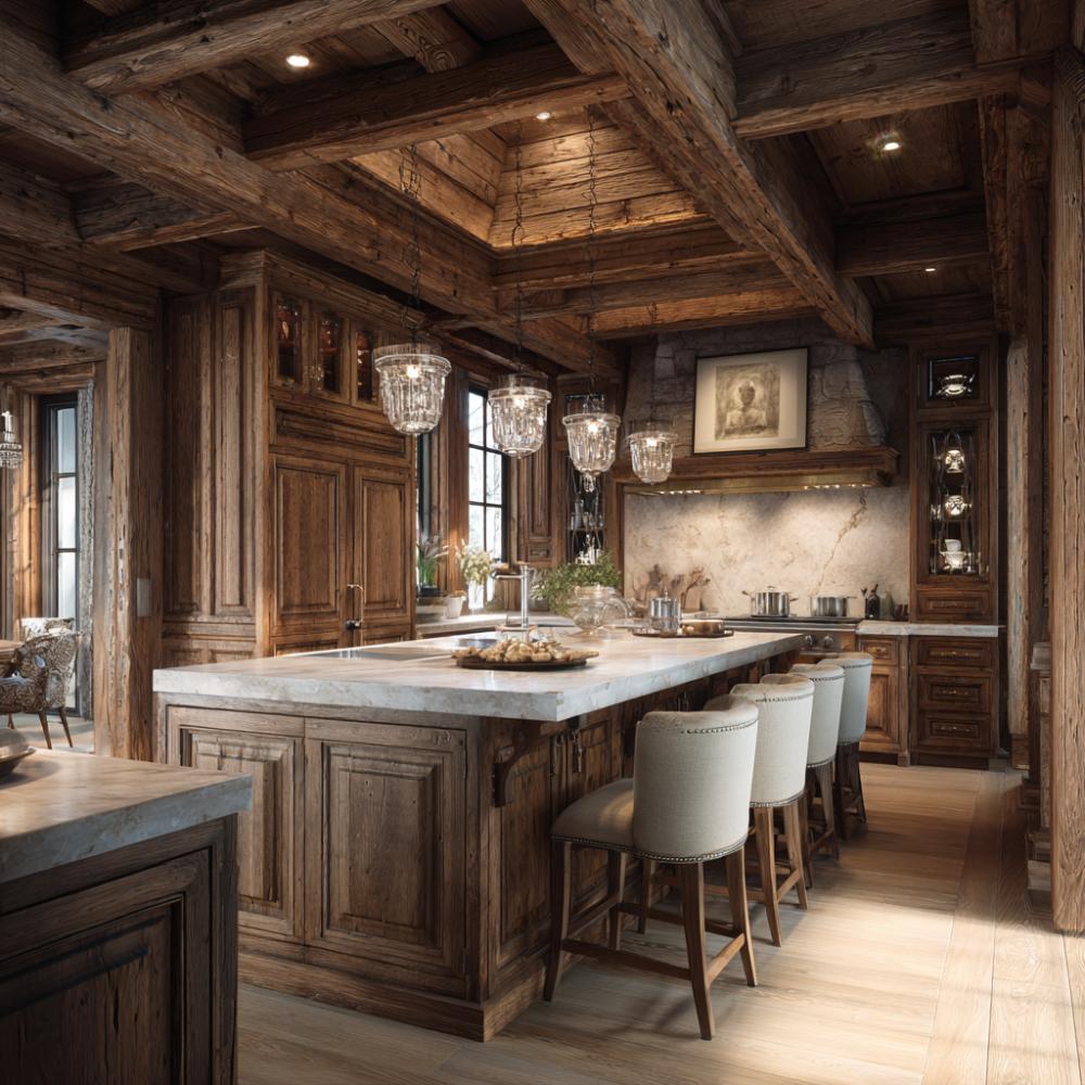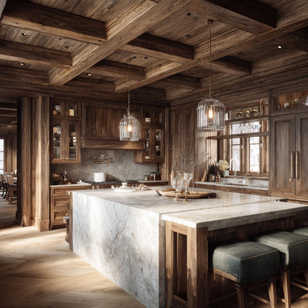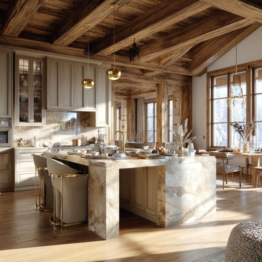 Rustic Wood Beams Meet Marble Luxury in Mountain Chalet Kitchen Design