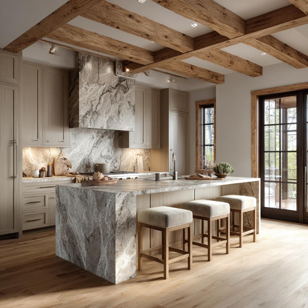 Rustic Marble Magnificence with Exposed Beam Drama