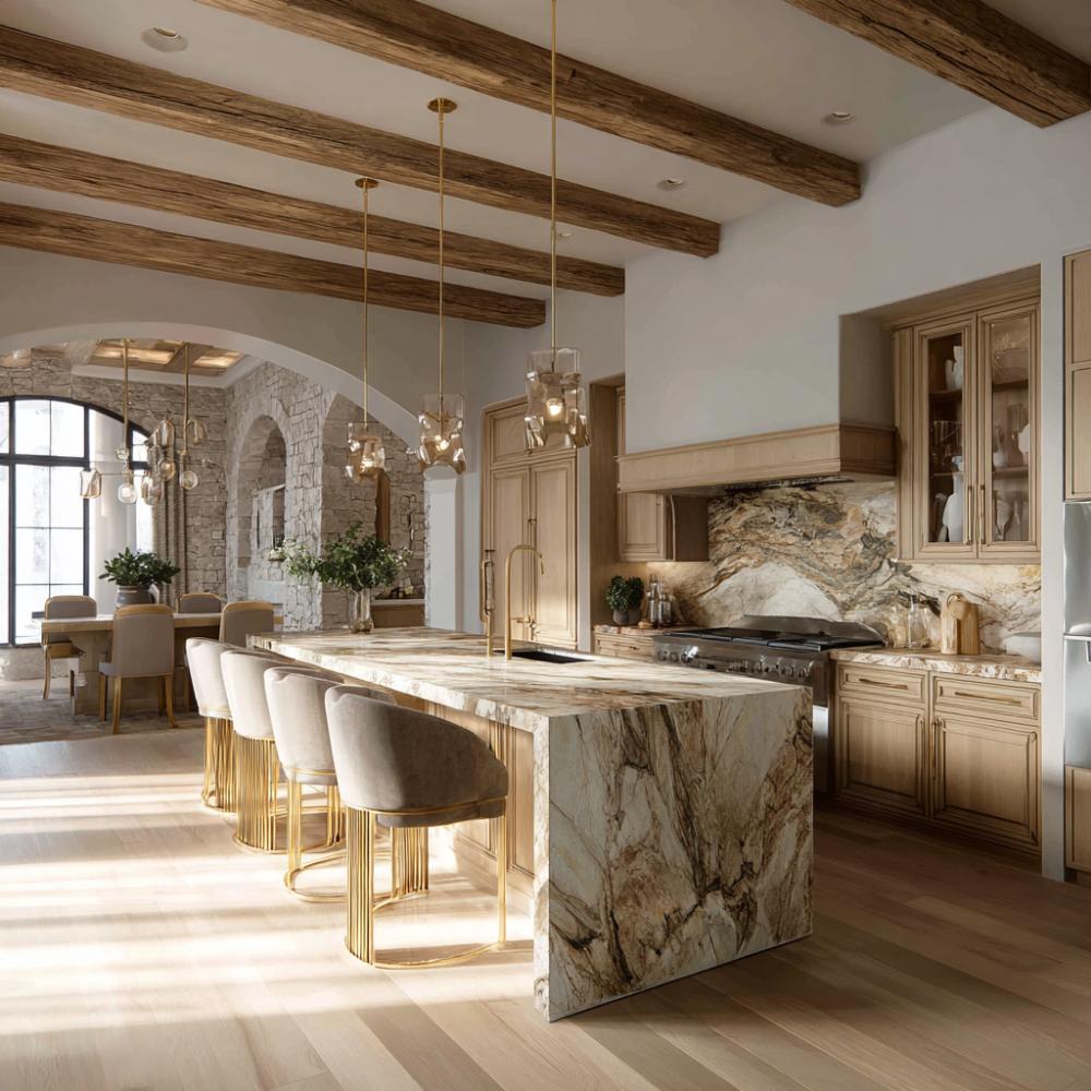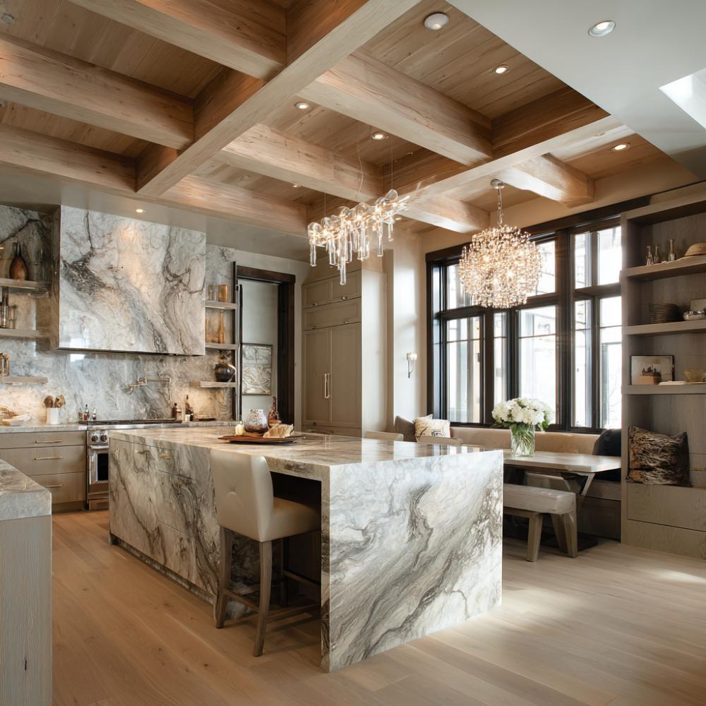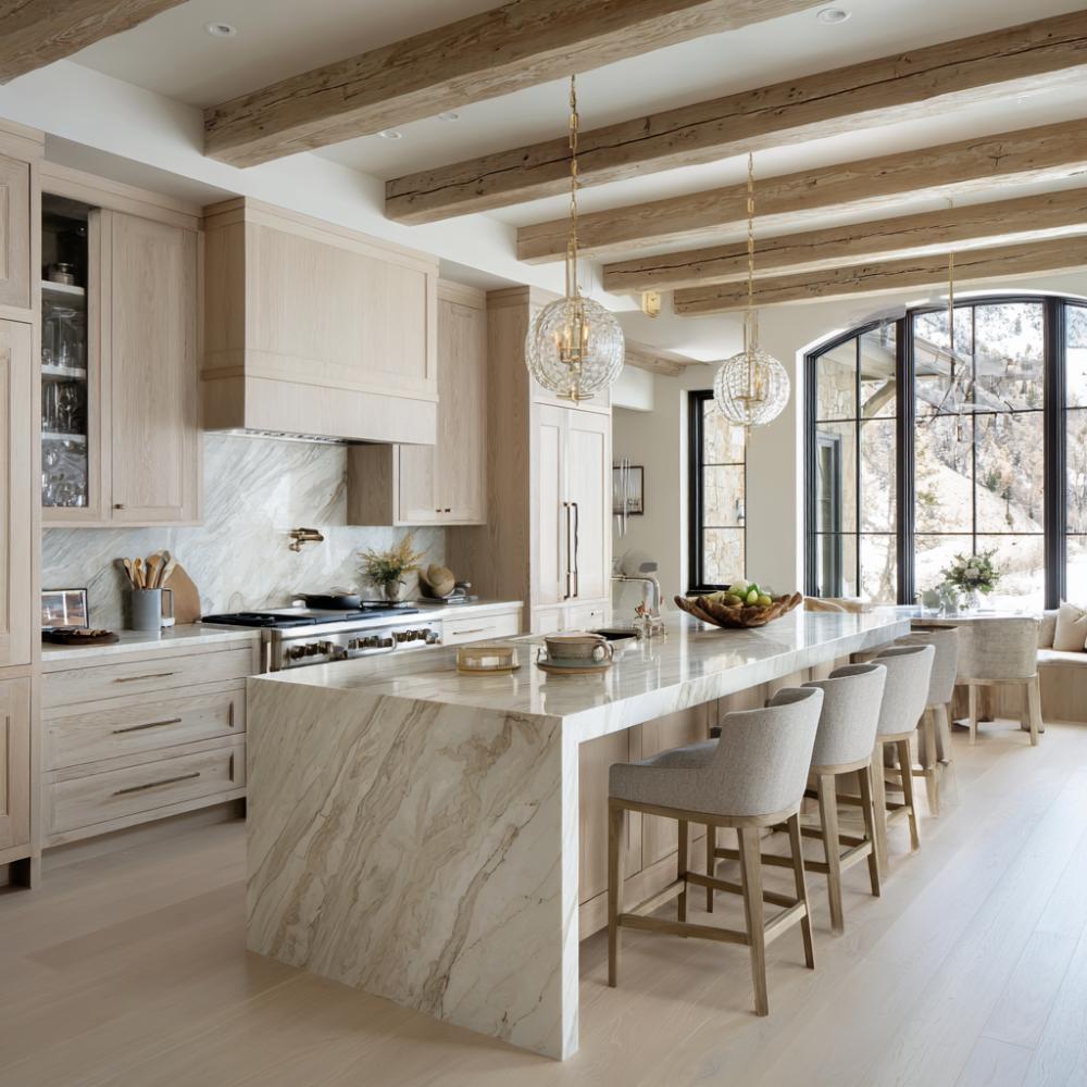 Exposed Beam Elegance Meets Marble Waterfall Island Sophistication