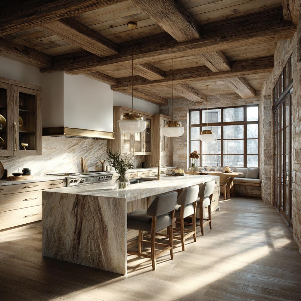Dramatic exposed wooden beams create a stunning architectural canopy above this sophisticated kitchen island. Natural stone waterfall countertops anchor the space while brass pendant lights add warm metallic accents. Light wood cabinetry balances the rich ceiling textures, and oversized windows flood the cooking zone with natural light. Upholstered counter stools invite casual dining beneath the rustic-luxe ceiling treatment.