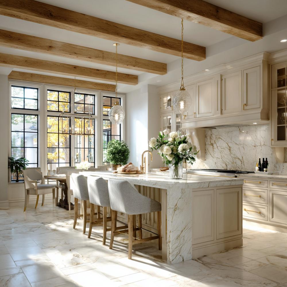 Exposed Beam Elegance Meets Marble Magnificence