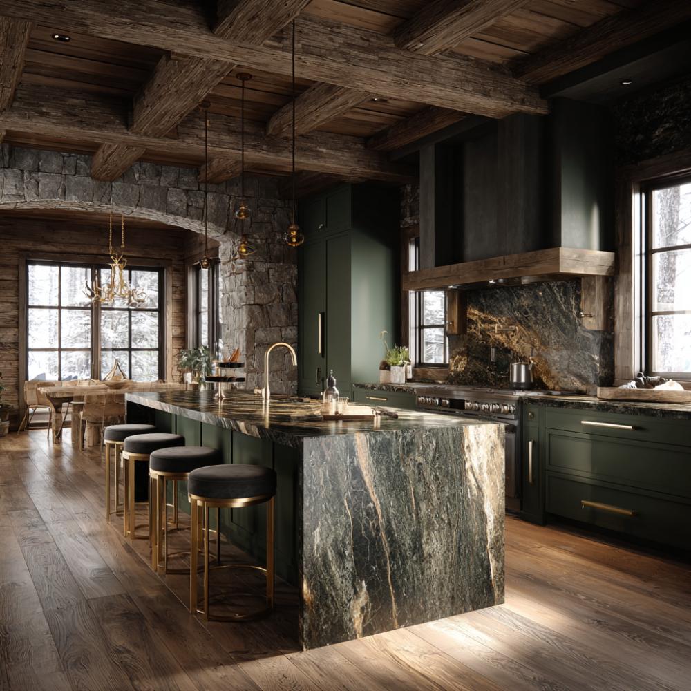 Forest Green Cabinets Meet Dramatic Veined Stone in Mountain Retreat