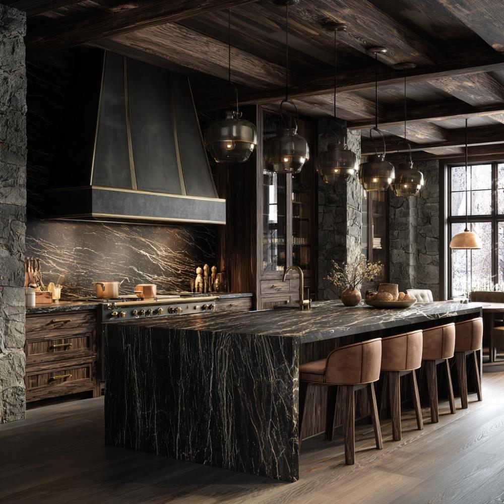 Rich walnut cabinetry pairs dramatically with black marble featuring striking golden veining throughout this sophisticated mountain retreat. Brass-trimmed range hood and cabinet hardware add warmth against the moody palette, while leather bar stools create intimate dining along the oversized waterfall island. Exposed timber beams and stone walls ground the space in natural textures.