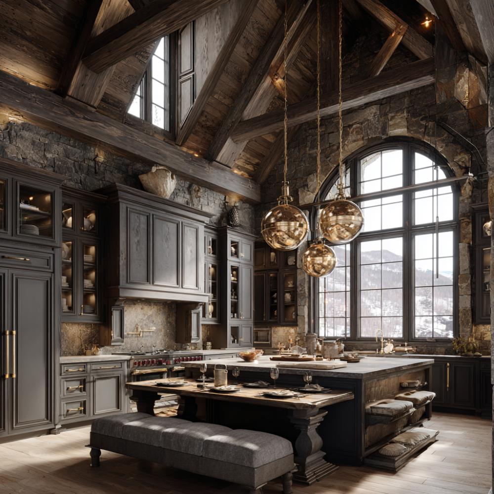 Exposed timber beams stretch across vaulted ceilings while natural stone walls create an impressive backdrop for this sophisticated mountain retreat kitchen. Gray-painted cabinetry balances rustic architecture with refined details, while hammered copper pendant lights add warmth above the spacious island. Rich wood flooring and professional-grade appliances complete this perfect blend of chalet charm and contemporary luxury living.