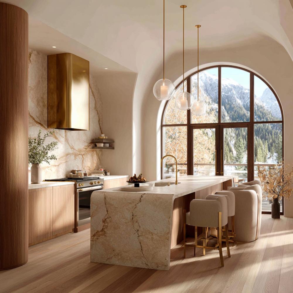 Dramatic veined marble creates a stunning waterfall island that anchors this sophisticated alpine kitchen. Rich walnut cabinetry pairs beautifully with the polished brass range hood, while the spectacular arched window frames breathtaking mountain views. Pendant lights cast warm light across cream upholstered bar stools, creating an inviting space where luxury meets natural beauty in perfect harmony.