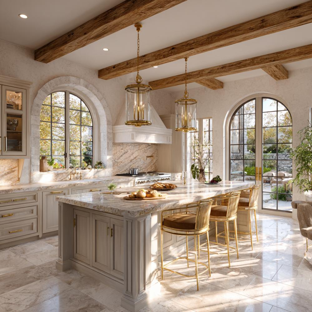 Exposed oak ceiling beams create dramatic contrast against soft limestone walls, while brass lantern pendants cast warm light over the marble waterfall island. Arched windows frame garden views and flood the space with natural light, complementing the neutral palette of cream cabinetry and travertine floors. Gold bar stools add metallic warmth to this sophisticated blend of Mediterranean architecture and alpine luxury.