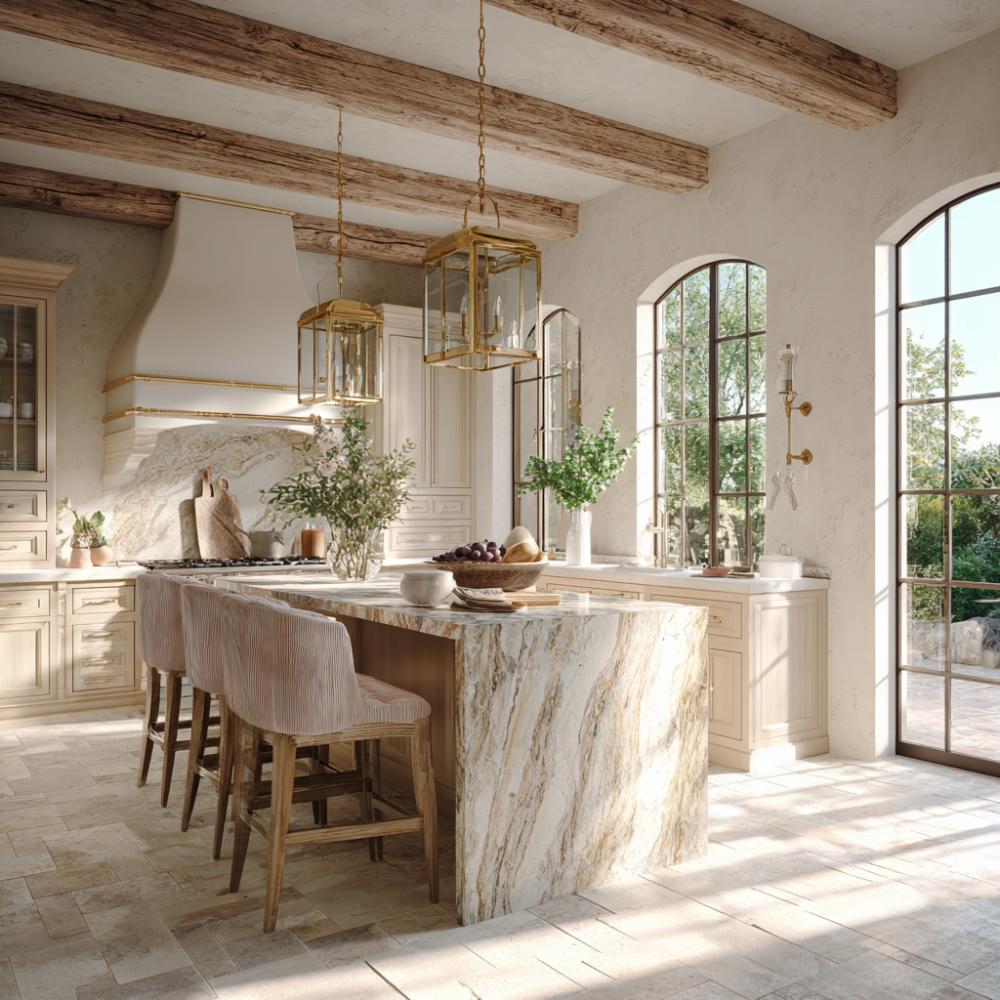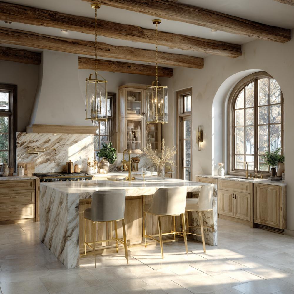 Warm wood ceiling beams create rustic charm while a dramatic marble waterfall island commands attention in this refined kitchen. Brass pendant lanterns cast elegant light over neutral bar stools, while creamy cabinetry provides timeless appeal. French doors flood the space with natural light, enhancing the luxurious marble veining and creating an inviting atmosphere perfect for entertaining.