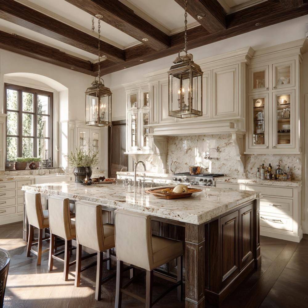 Exposed dark wood ceiling beams create dramatic contrast against cream cabinetry and marble countertops in this sophisticated kitchen. Lantern-style pendant lights illuminate a substantial walnut island, while glass-front upper cabinets display curated dishware. Natural light streams through arched windows, highlighting the rich textures of stone backsplash and polished granite surfaces that define this refined culinary space.