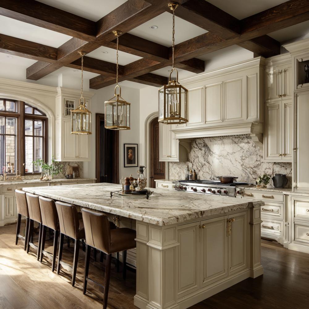 Exposed dark walnut ceiling beams create dramatic contrast against crisp white coffered details in this sophisticated kitchen. Creamy painted cabinetry pairs beautifully with veined marble countertops and backsplash, while brass lantern pendants add warmth. Leather-upholstered counter stools and rich hardwood floors complete the luxurious yet welcoming atmosphere that balances rustic charm with refined elegance.
