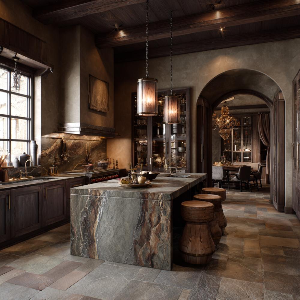 Medieval Castle Grandeur Meets Alpine Luxury in Dramatic Stone Kitchen