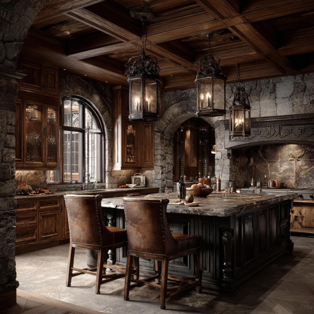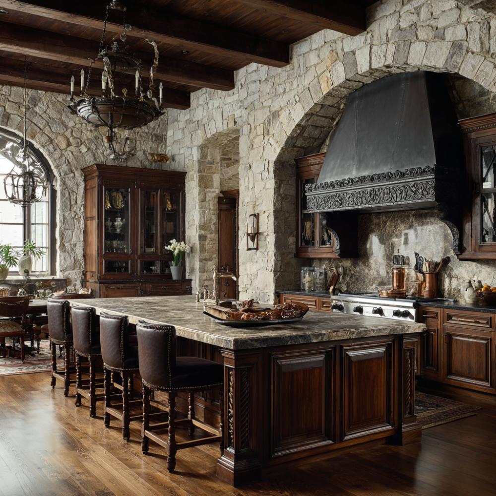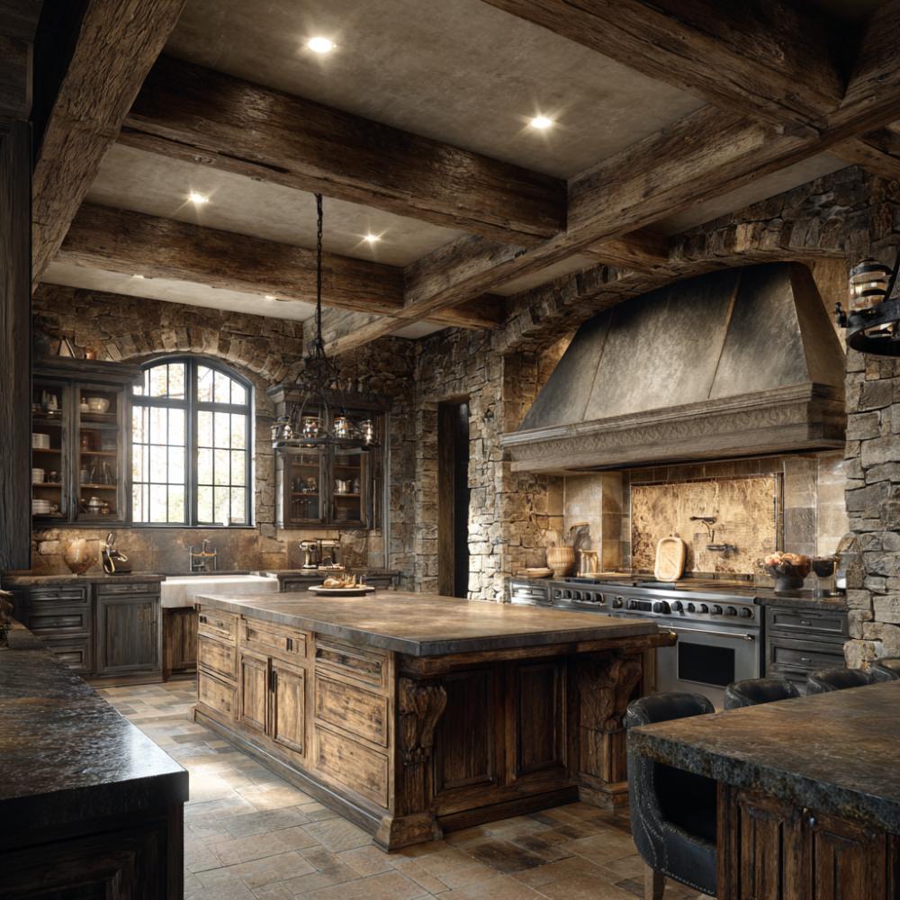 Massive reclaimed oak beams frame this fortress-inspired culinary sanctuary where weathered stone walls meet professional-grade appliances. Hand-hewn wooden cabinetry showcases rich grain patterns while wrought iron chandeliers cast dramatic shadows across natural stone surfaces. The oversized kitchen island anchors the space, blending old-world craftsmanship with modern functionality for serious home chefs.
