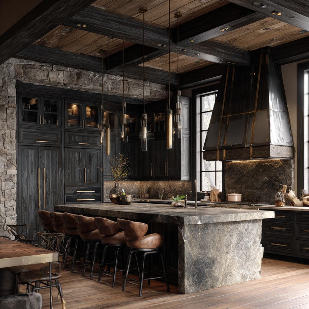 Weathered stone walls anchor this dramatic mountain kitchen where charcoal-stained cabinetry meets raw natural elements. Exposed timber beams create architectural drama overhead while a stunning stone waterfall island commands attention below. Bronze pendant lights cascade from the coffered ceiling, casting warm pools of light across the rich marble surfaces. Cognac leather barstools add luxurious seating that complements the moody palette perfectly.