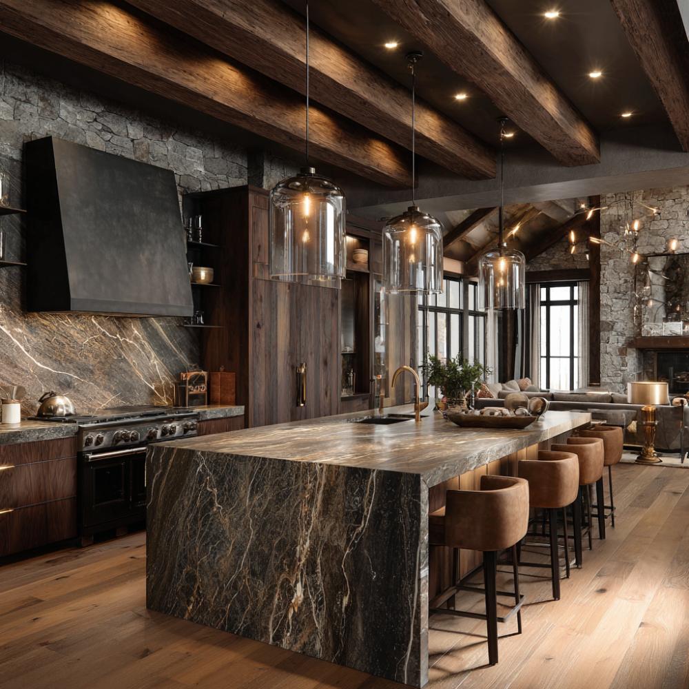 Dark marble veining cascades down this dramatic waterfall island, creating a stunning focal point against rich walnut cabinetry. Exposed wooden beams overhead feature integrated lighting that highlights natural textures throughout the space. Glass cylinder pendants illuminate cognac leather bar stools, while stone walls and wide-plank floors complete the luxurious mountain aesthetic that seamlessly blends rugged materials with sophisticated finishes.