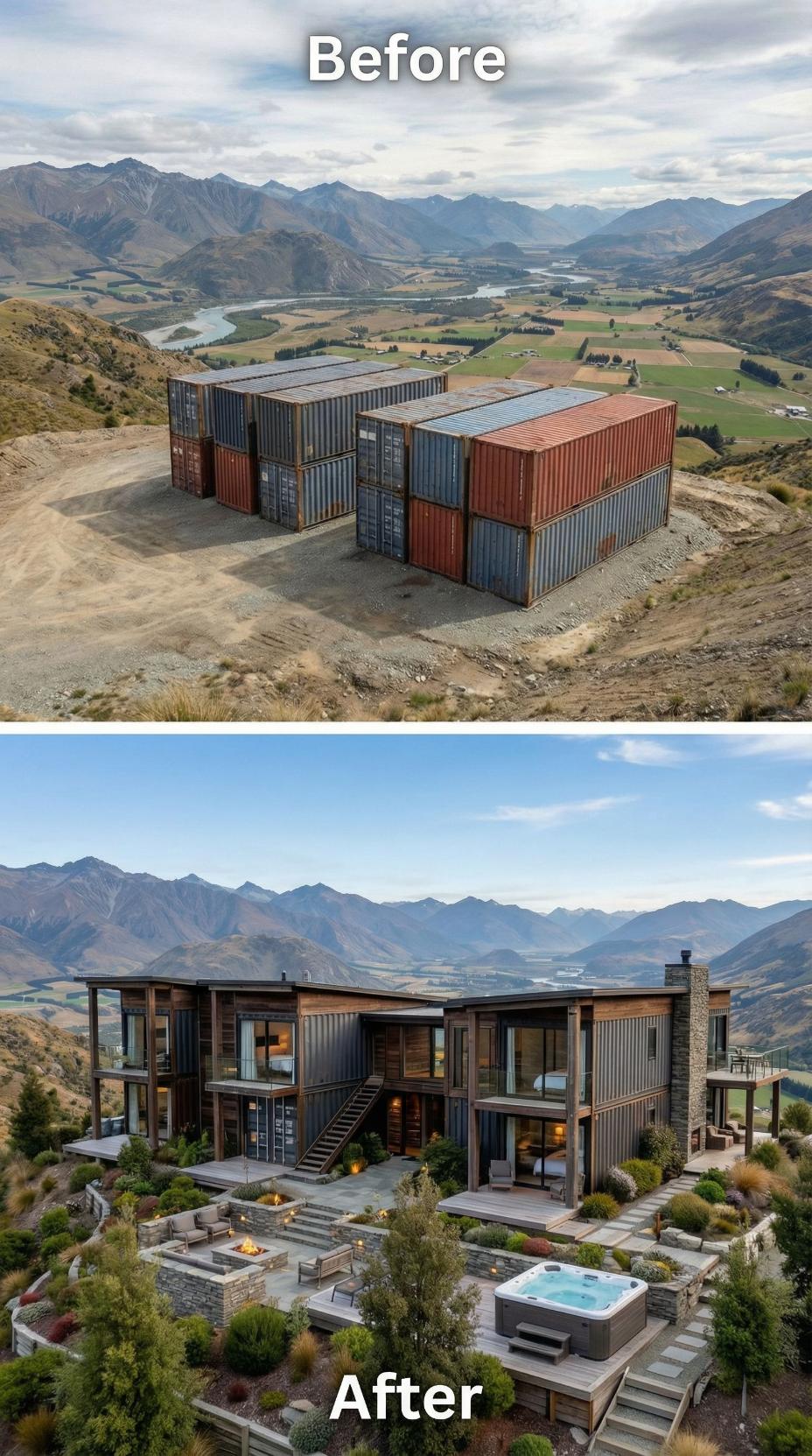 Used shipping containers underwent a dramatic metamorphosis into this stunning alpine retreat featuring expansive glass walls and natural stone accents. The transformation replaced industrial corrugated metal with sleek contemporary architecture that frames breathtaking valley views. Multiple levels cascade down the hillside, incorporating infinity pool terraces, landscaped gardens, and seamless indoor-outdoor living spaces that completely reimagine the original cargo containers.