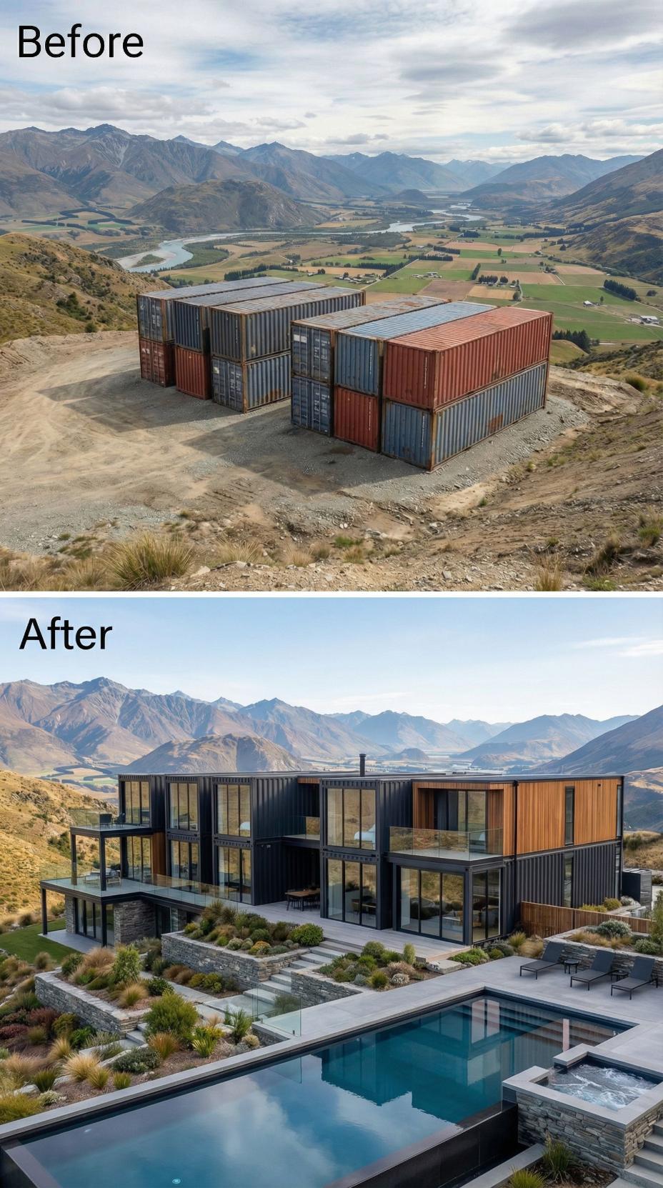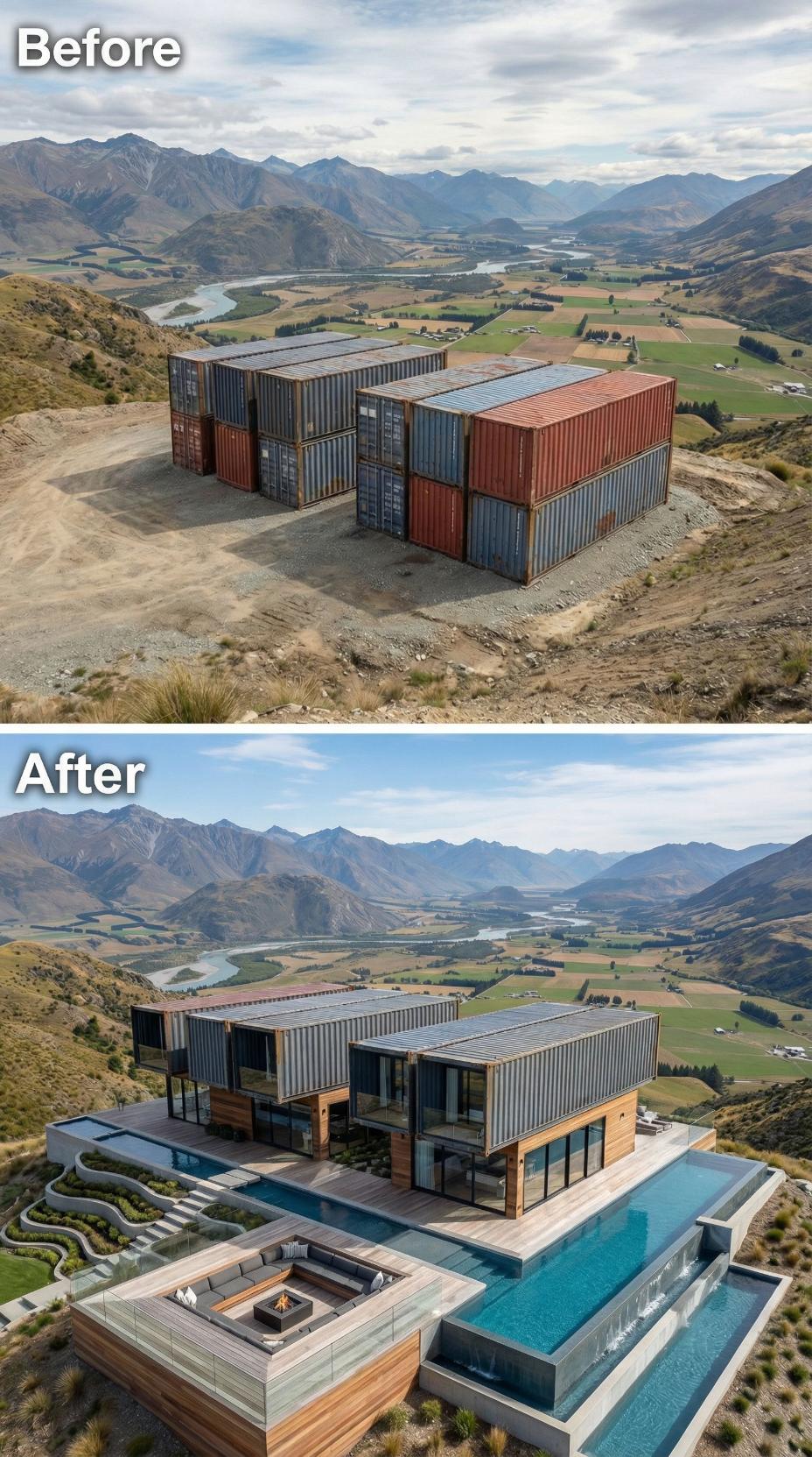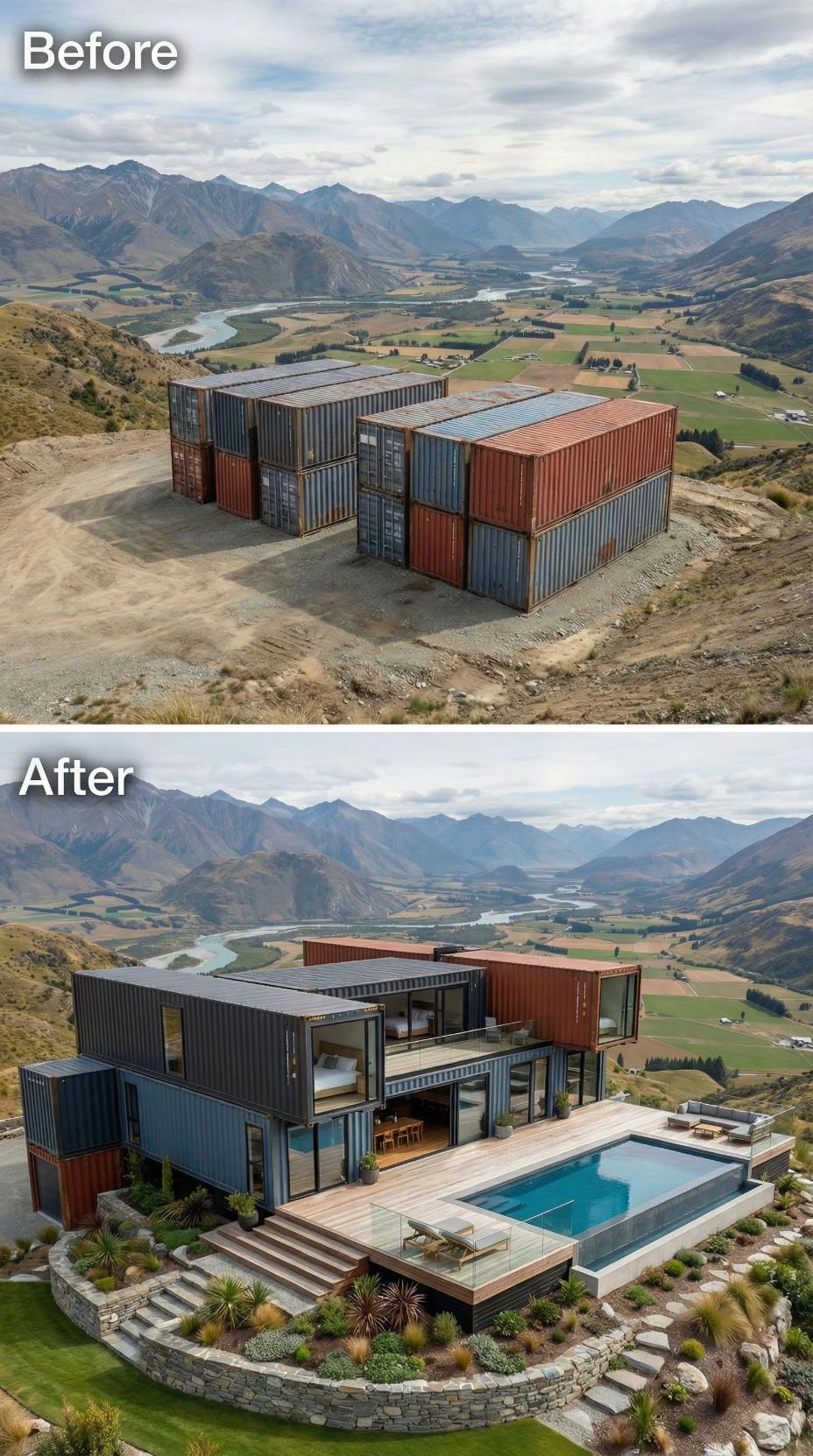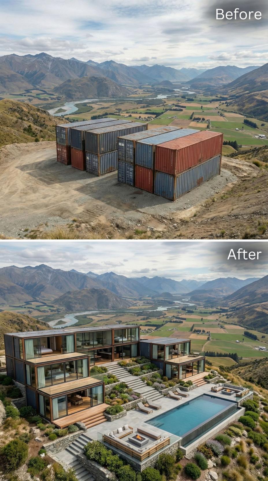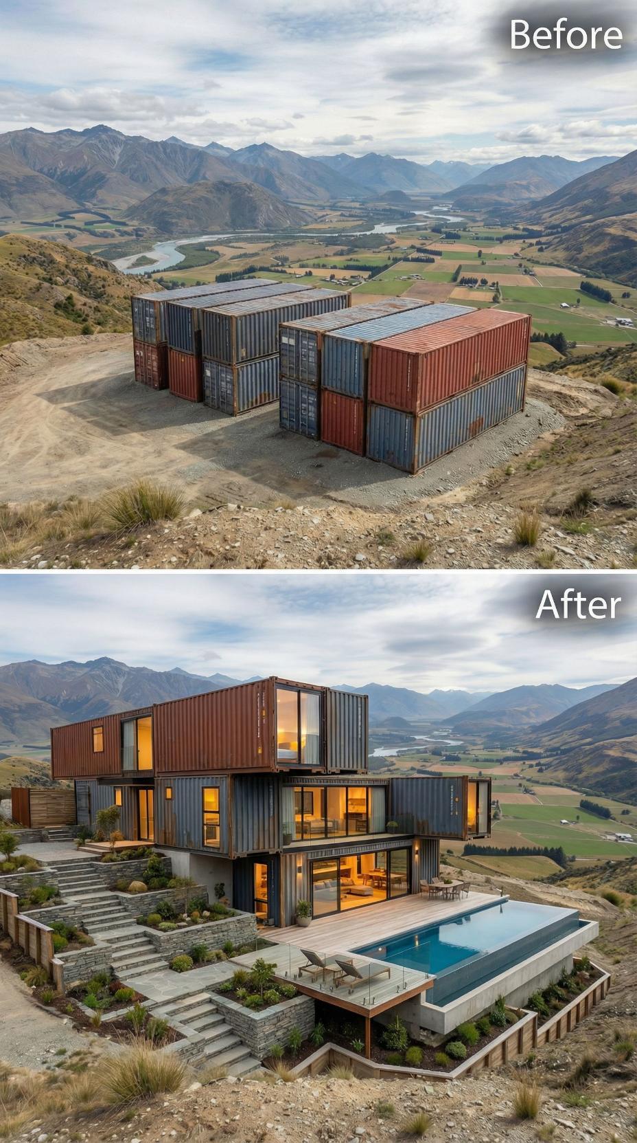 Used shipping containers undergo a stunning metamorphosis into this architectural masterpiece overlooking dramatic mountain peaks. The transformation elevates industrial steel boxes into a sophisticated modern residence featuring expansive glass walls, integrated solar panels, and premium outdoor living spaces. Multiple infinity pools create seamless water features that mirror the sky, while elevated decking and contemporary landscaping replace the original bare ground, demonstrating how creative vision transforms humble cargo containers into luxury.