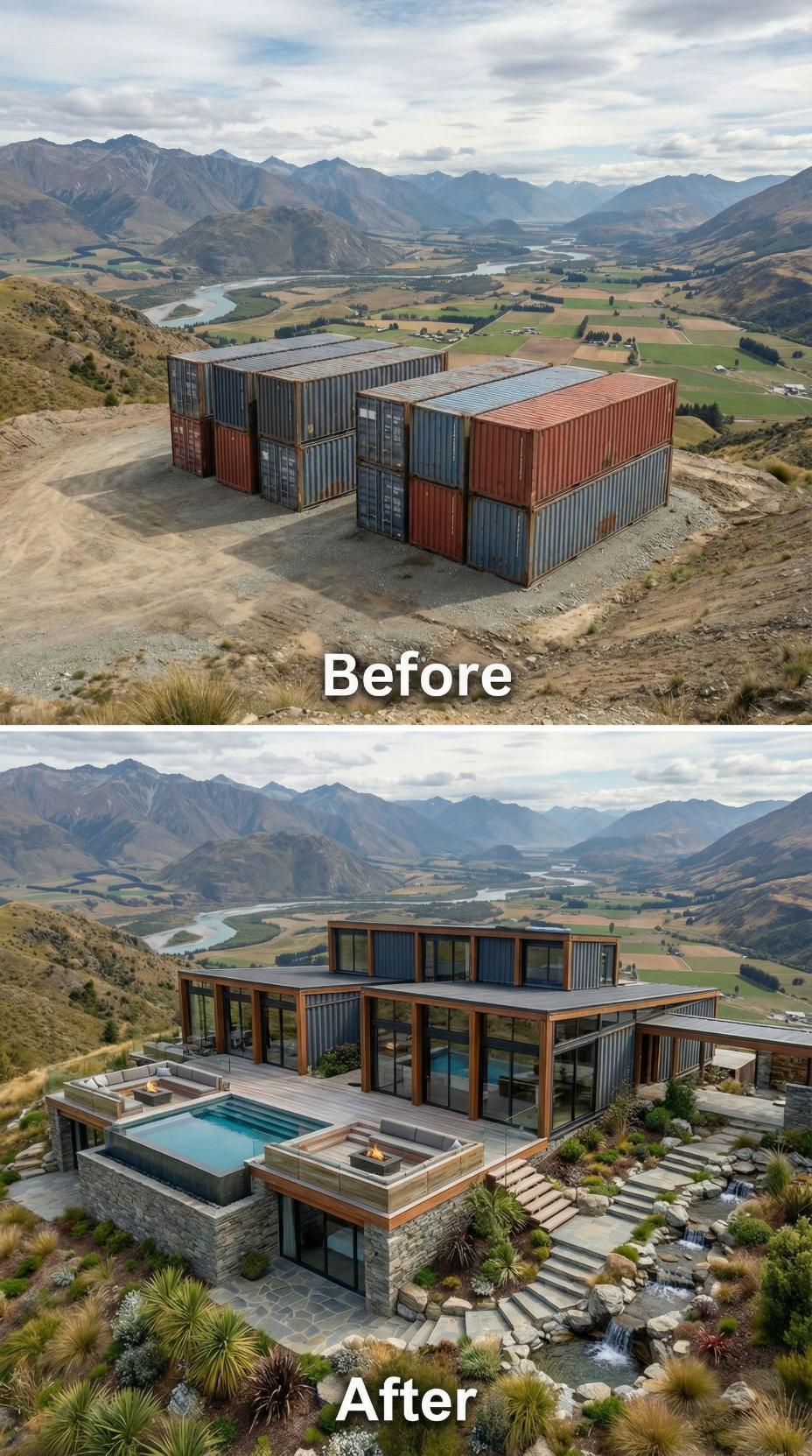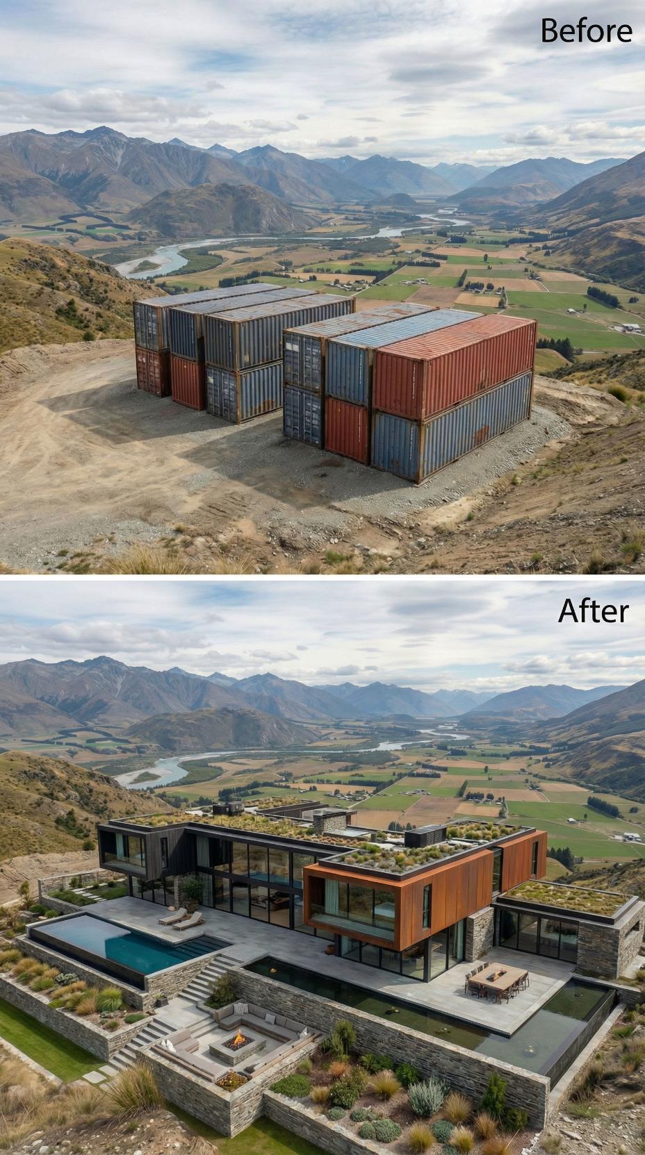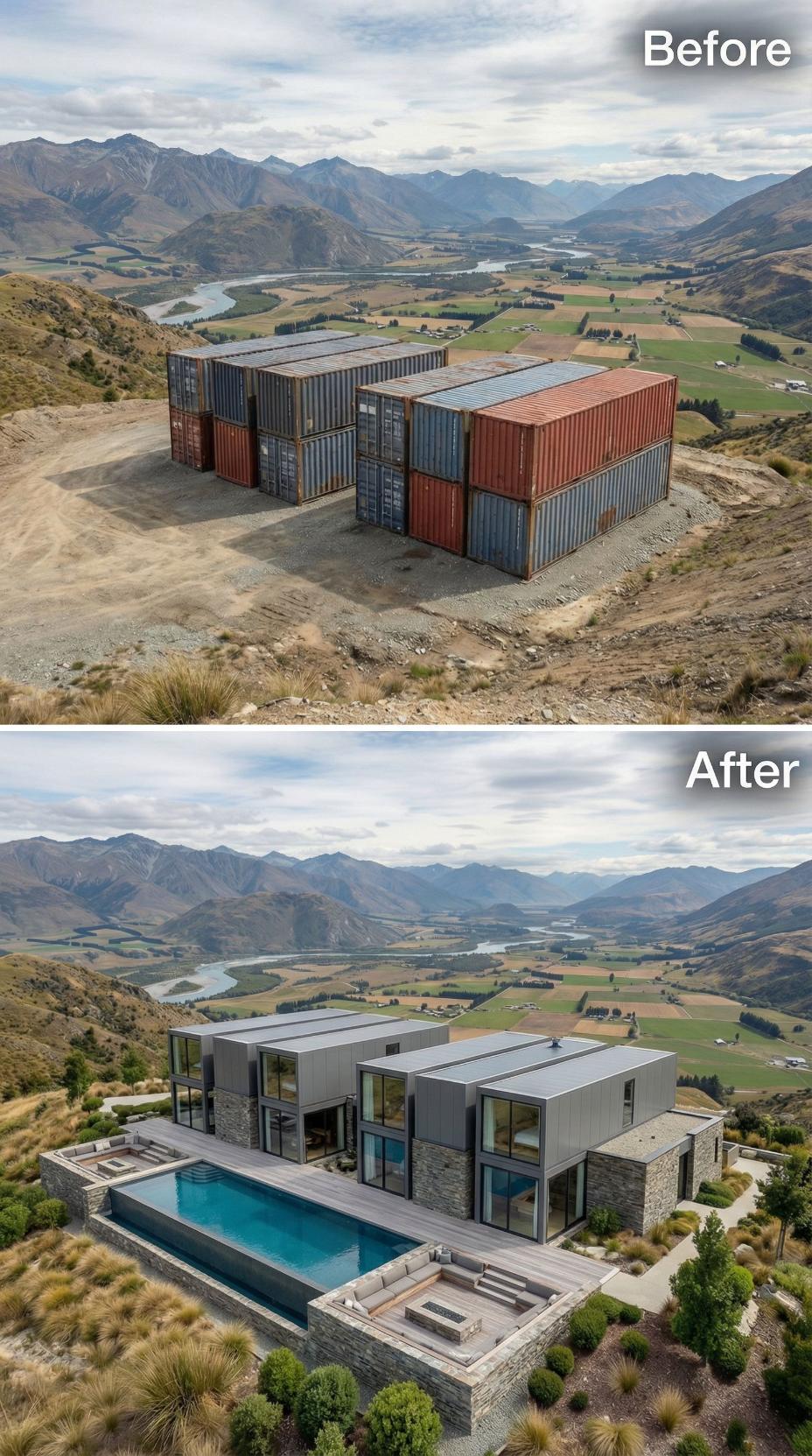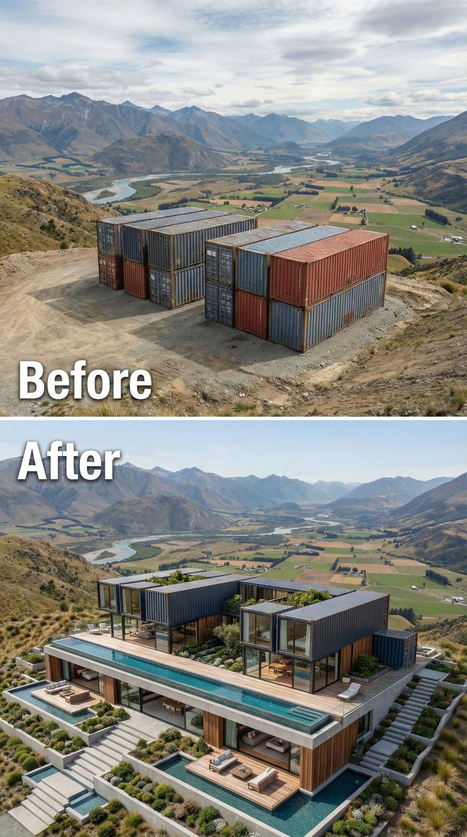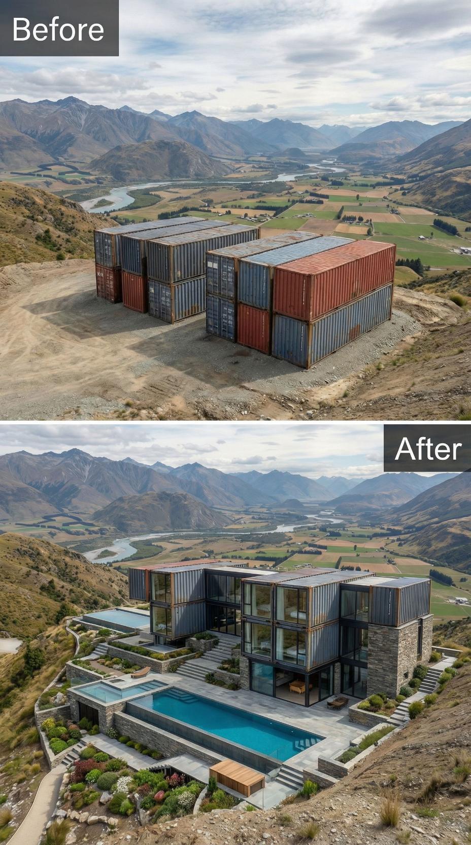 Used shipping containers undergo a stunning metamorphosis into this architectural masterpiece overlooking dramatic mountain peaks. The transformation elevates industrial steel boxes into a sophisticated modern residence featuring expansive glass walls, integrated solar panels, and premium outdoor living spaces. Multiple infinity pools create seamless water features that mirror the sky, while elevated decking and contemporary landscaping replace the original bare ground, demonstrating how creative vision transforms humble cargo containers into luxury.