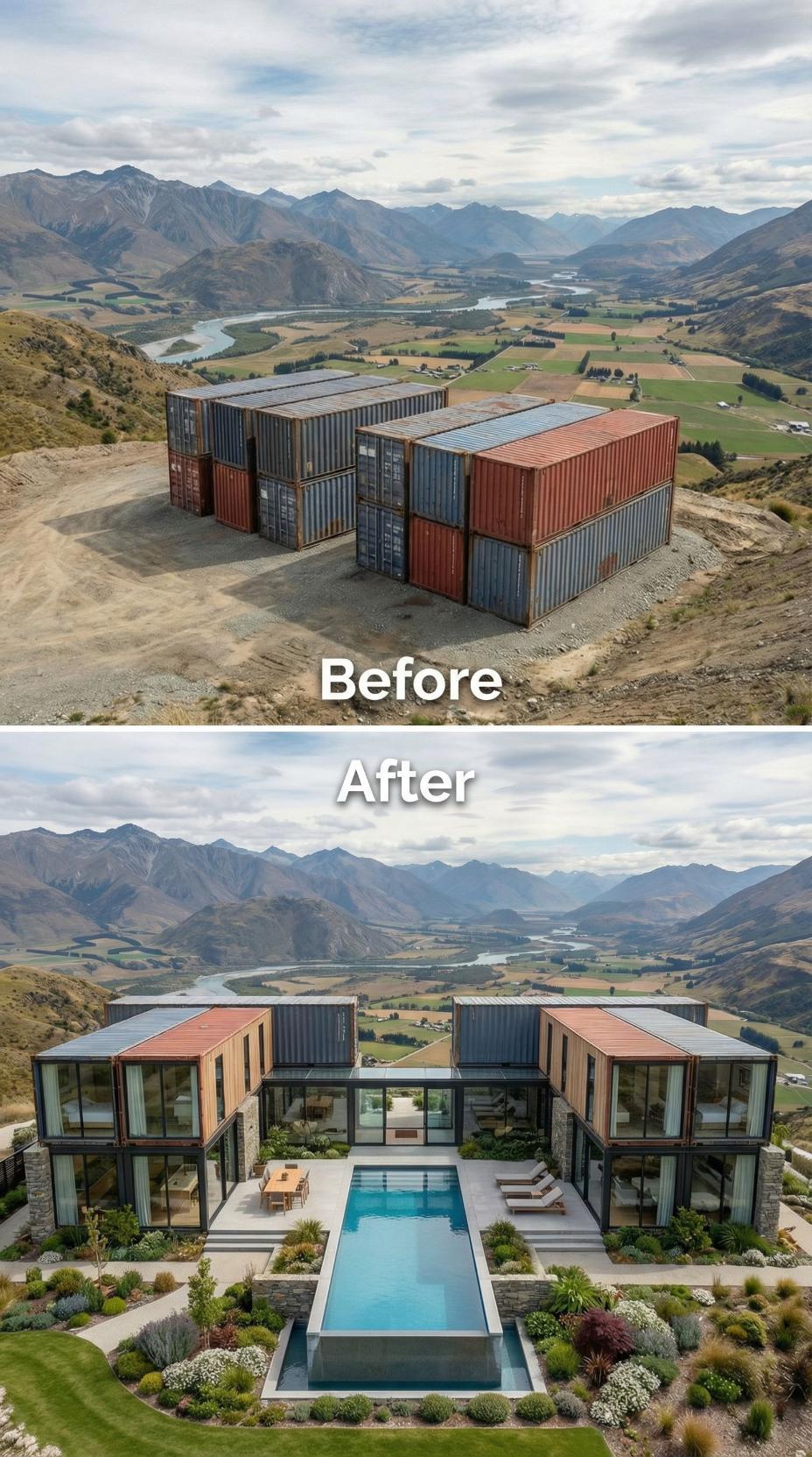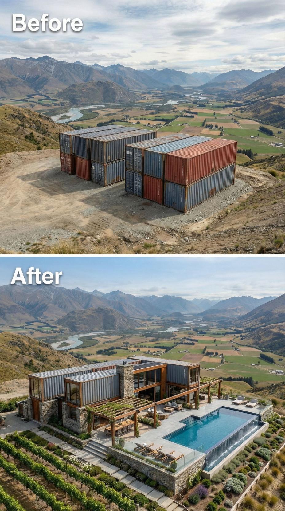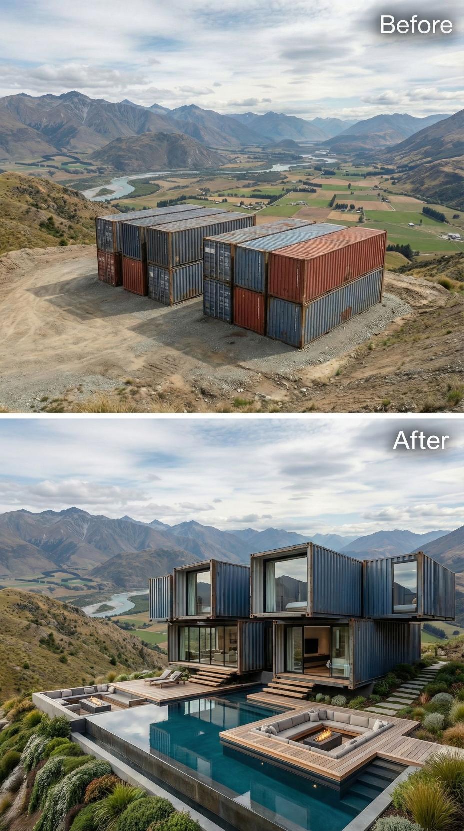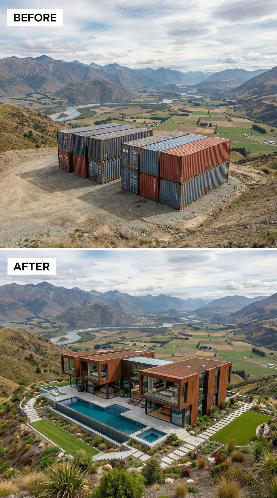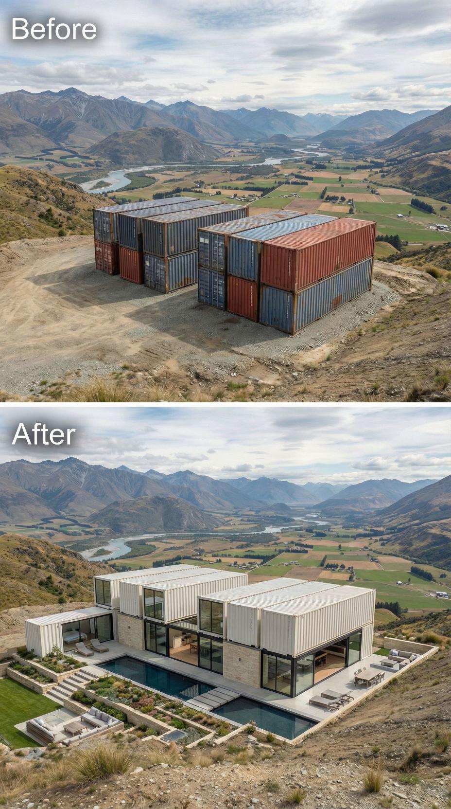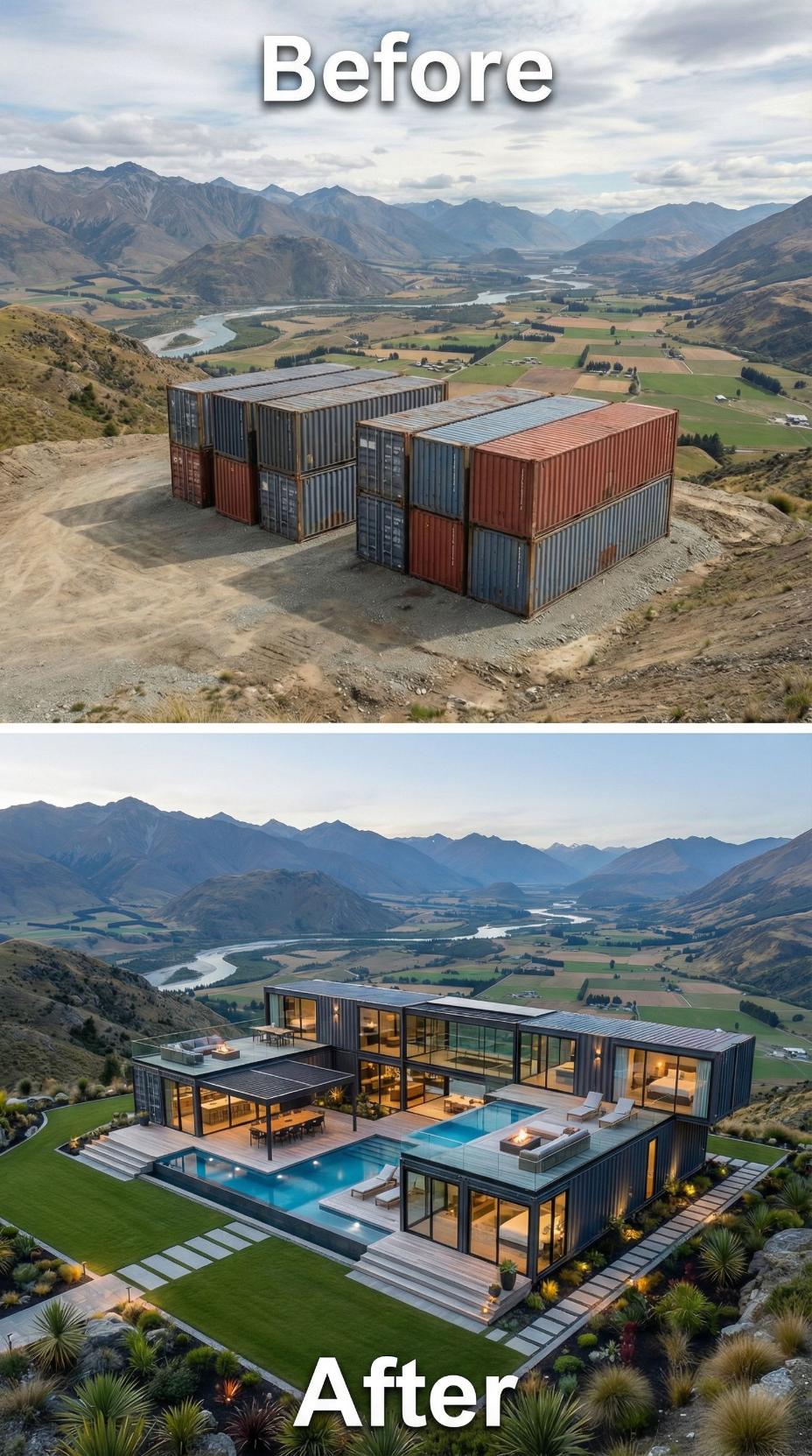 Used shipping containers undergo a stunning metamorphosis into this architectural masterpiece overlooking dramatic mountain peaks. The transformation elevates industrial steel boxes into a sophisticated modern residence featuring expansive glass walls, integrated solar panels, and premium outdoor living spaces. Multiple infinity pools create seamless water features that mirror the sky, while elevated decking and contemporary landscaping replace the original bare ground, demonstrating how creative vision transforms humble cargo containers into luxury.