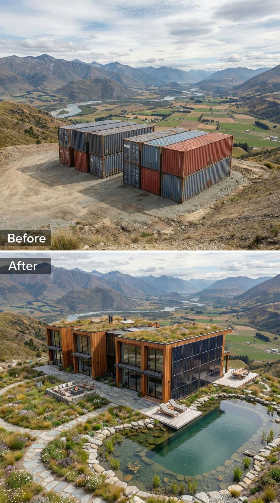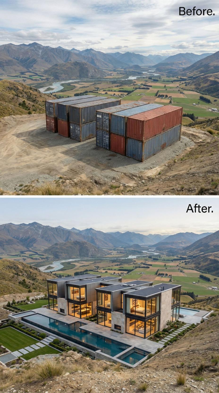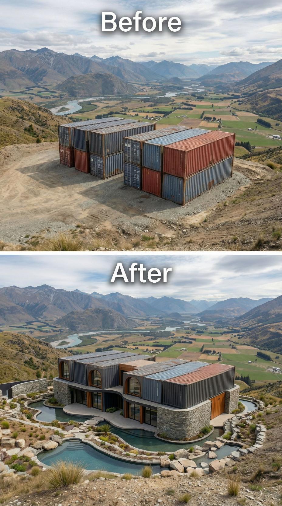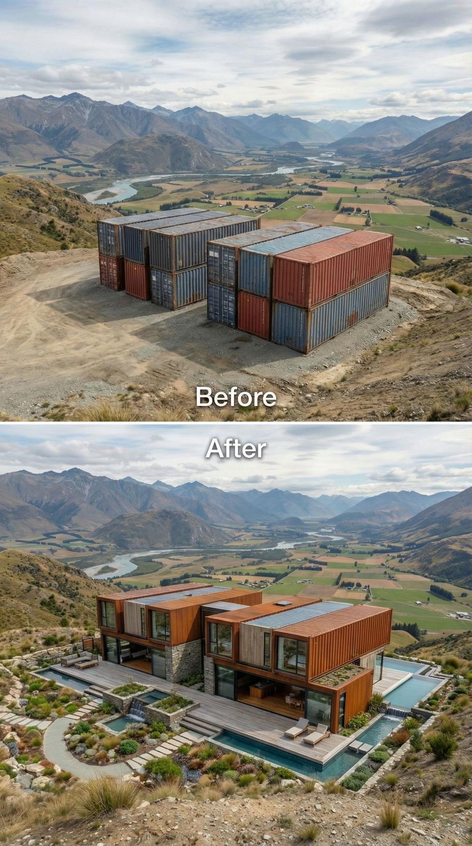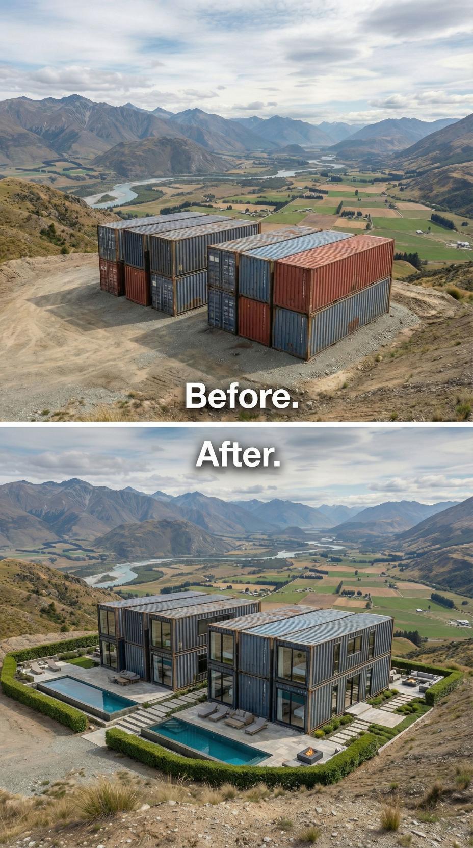 Used shipping containers undergo a stunning metamorphosis into this architectural masterpiece overlooking dramatic mountain peaks. The transformation elevates industrial steel boxes into a sophisticated modern residence featuring expansive glass walls, integrated solar panels, and premium outdoor living spaces. Multiple infinity pools create seamless water features that mirror the sky, while elevated decking and contemporary landscaping replace the original bare ground, demonstrating how creative vision transforms humble cargo containers into luxury.