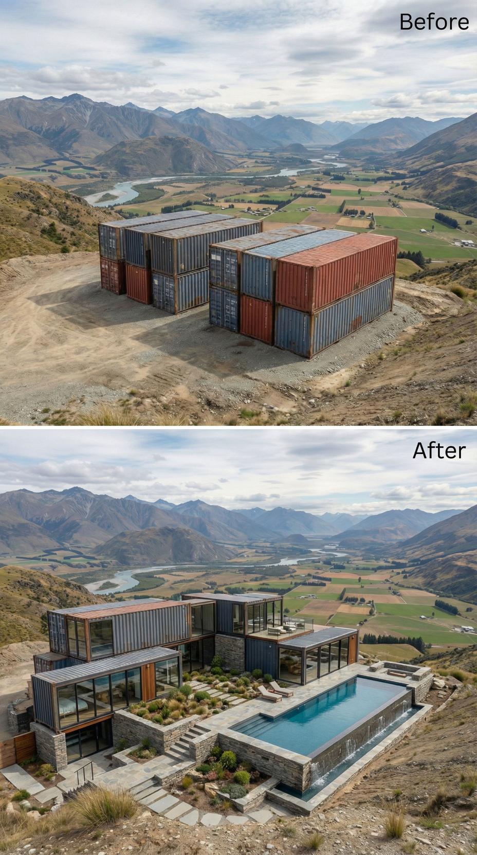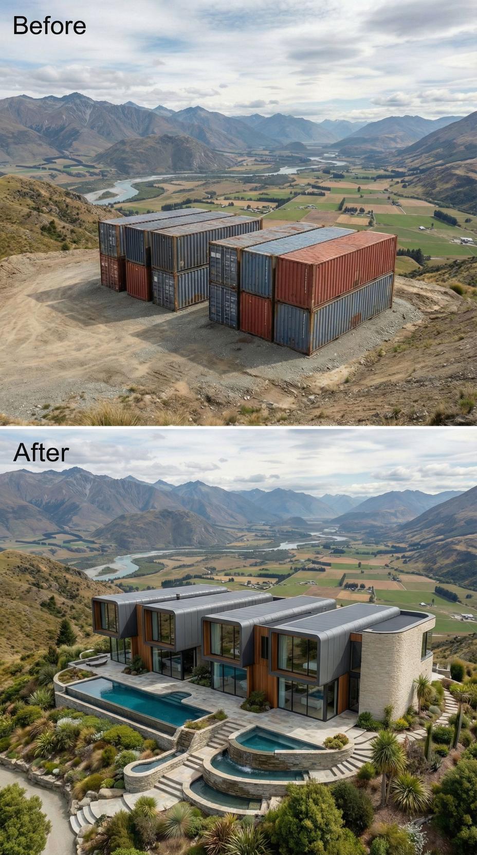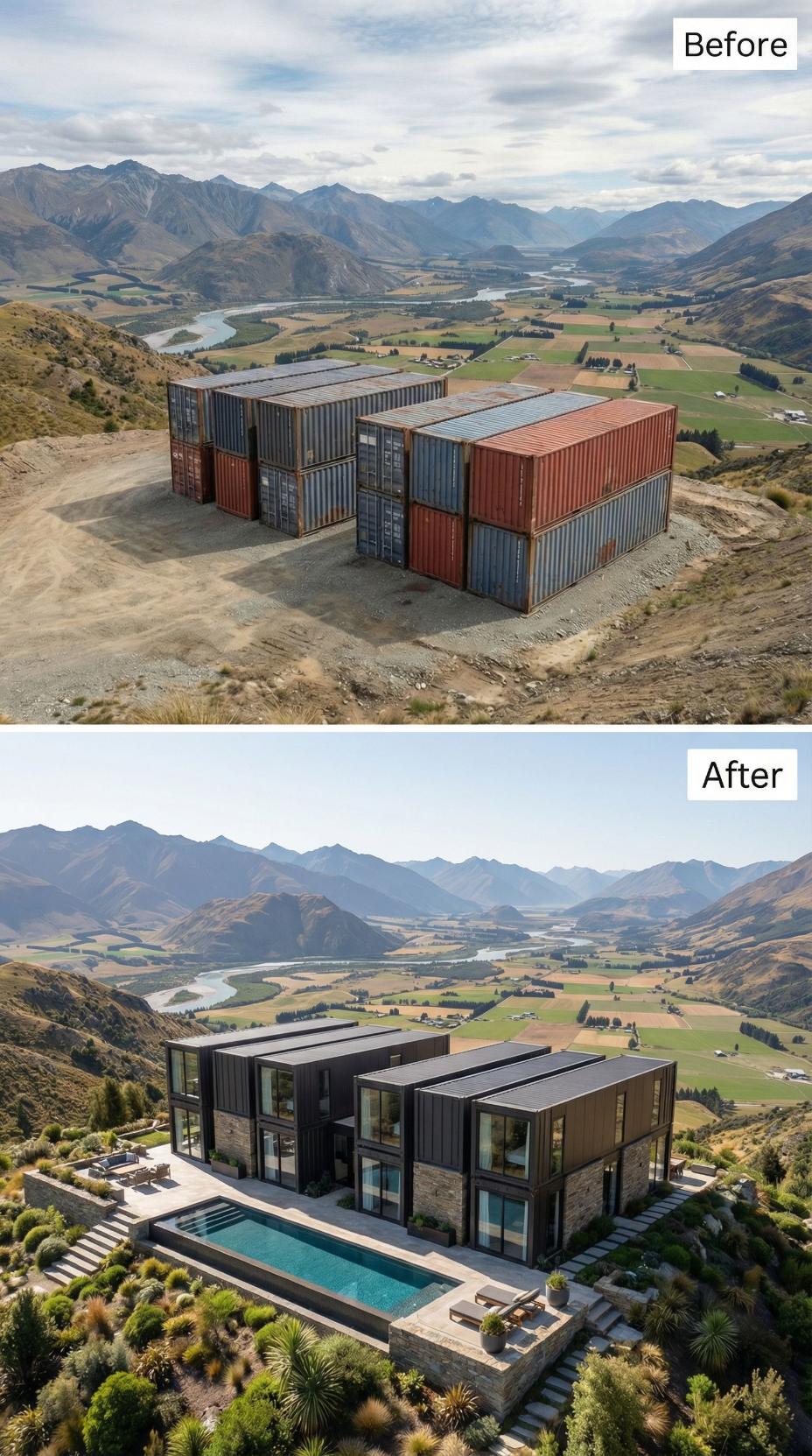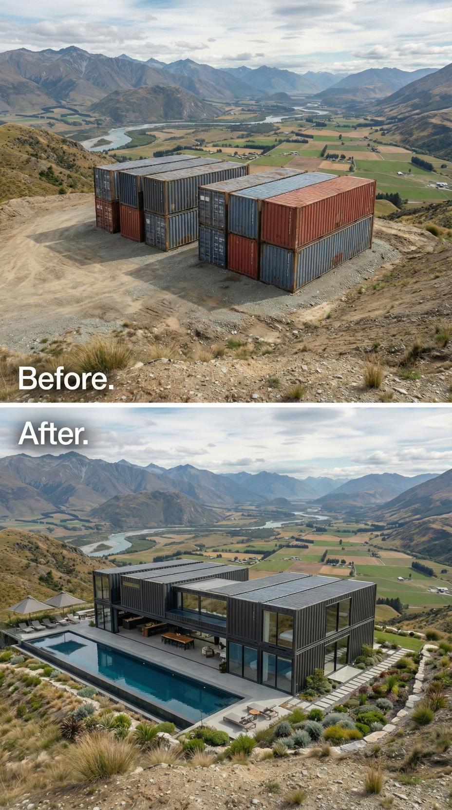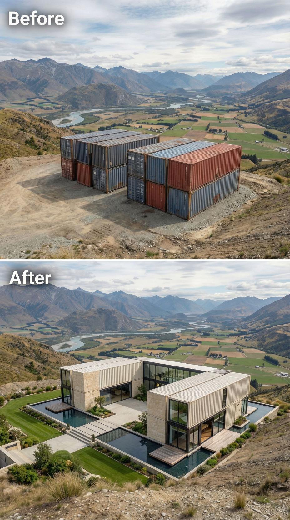 Used shipping containers undergo a stunning metamorphosis into this architectural masterpiece overlooking dramatic mountain peaks. The transformation elevates industrial steel boxes into a sophisticated modern residence featuring expansive glass walls, integrated solar panels, and premium outdoor living spaces. Multiple infinity pools create seamless water features that mirror the sky, while elevated decking and contemporary landscaping replace the original bare ground, demonstrating how creative vision transforms humble cargo containers into luxury.