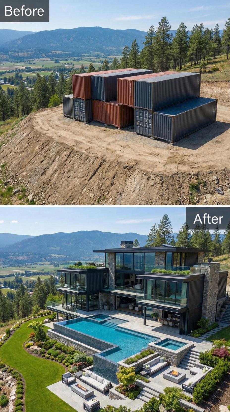 What started as a simple idea quickly turned into something far more ambitious. Instead of building a conventional mountain home, this family went all in—buying stacks of old shipping containers and reimagining them as the bones of a glimmering $10-million-plus mountain mansion. Set high above a sweeping valley, the project blends bold architecture, dramatic glass, and meticulous landscaping into a home that feels equal parts daring experiment and refined luxury retreat.
