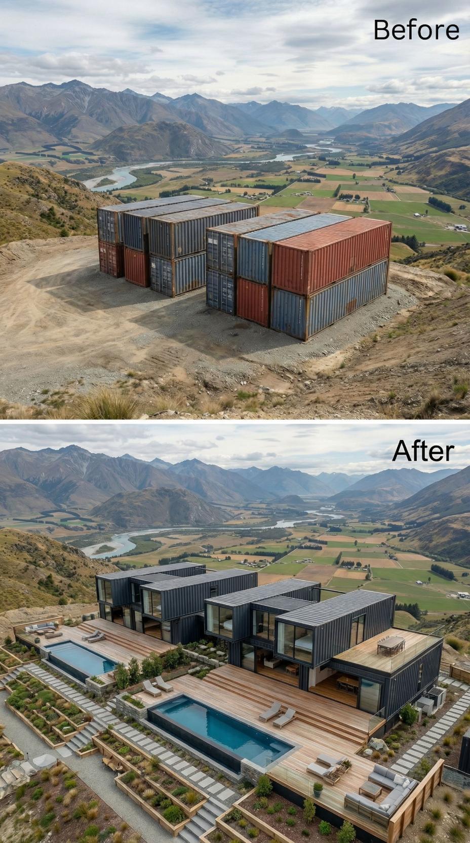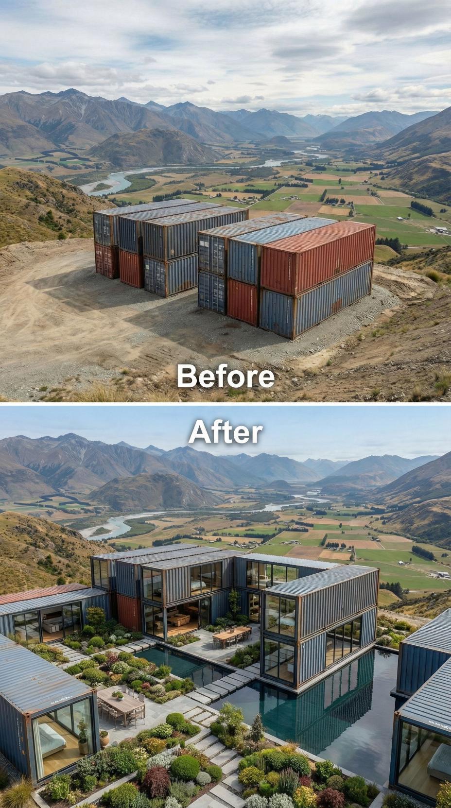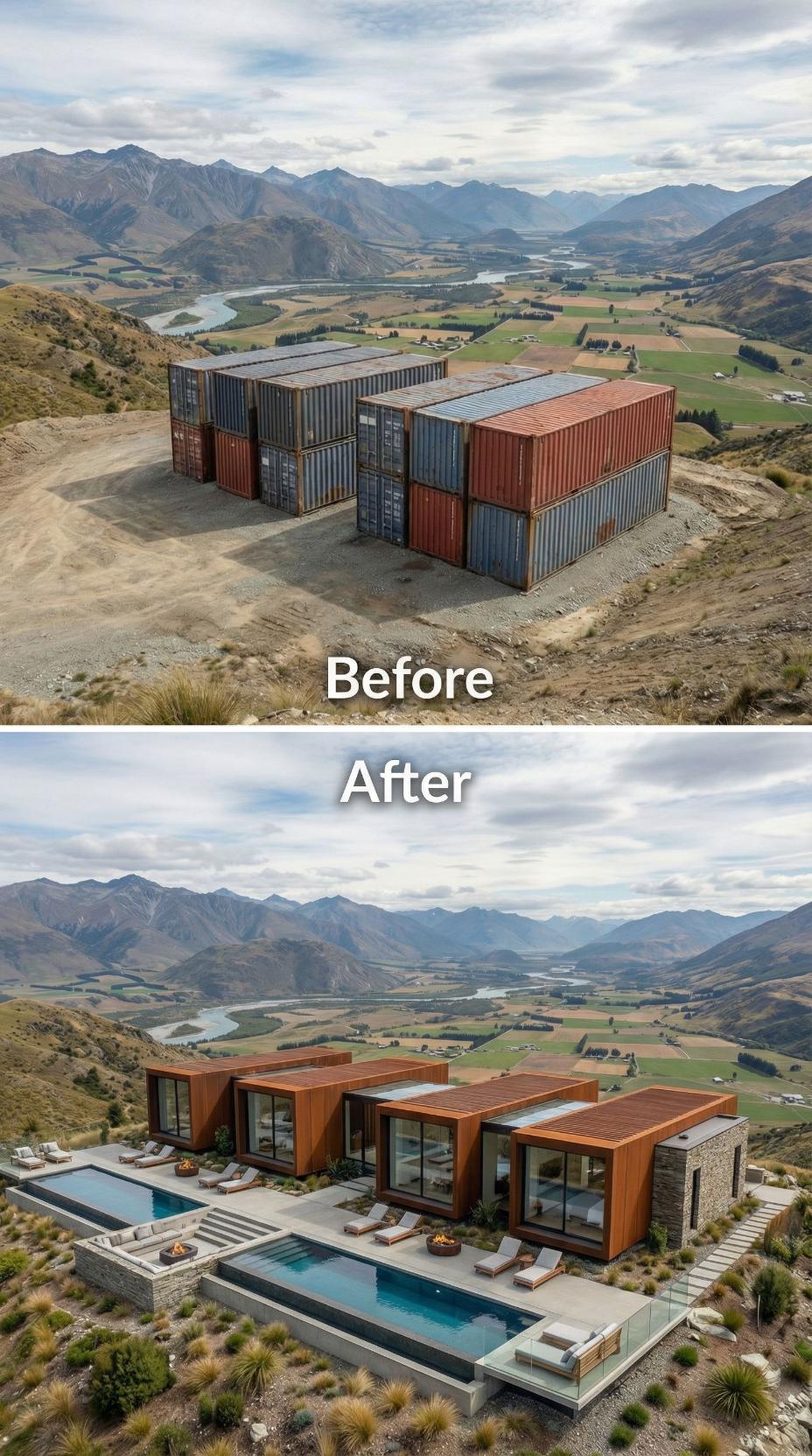 Weathered cargo containers undergo a stunning metamorphosis into sleek contemporary villas with floor-to-ceiling windows and warm corten steel cladding. The transformation adds expansive infinity pools, stone terracing, and sophisticated outdoor lounging areas that frame the dramatic mountain vistas. Modern architectural elements replace industrial features, creating seamless indoor-outdoor living spaces perfect for luxury mountain retreats.