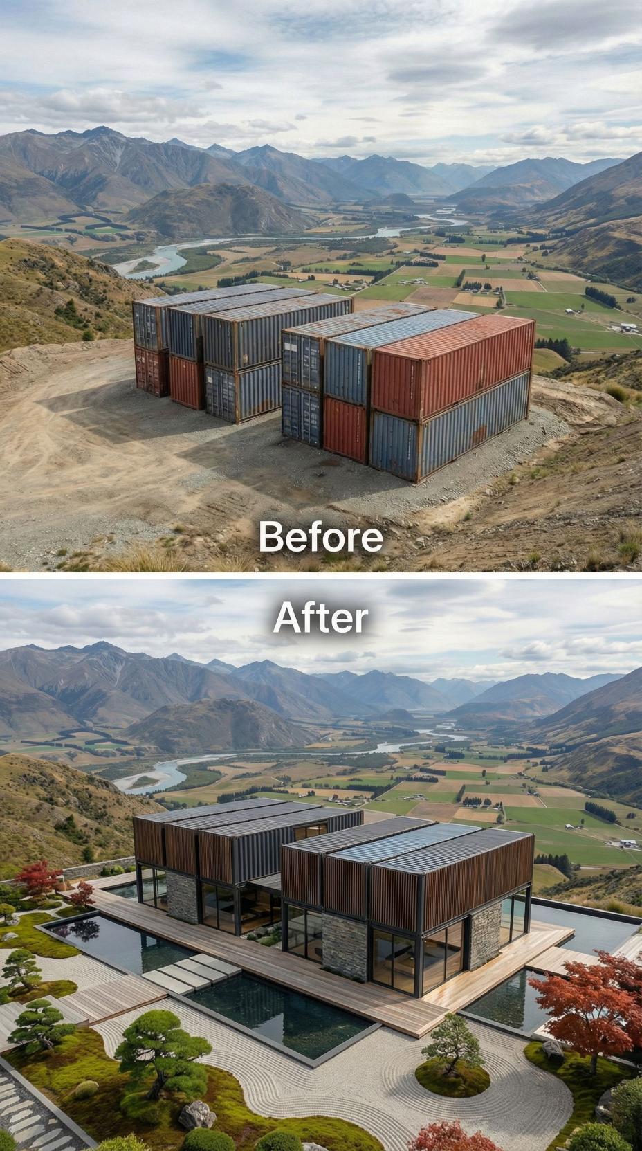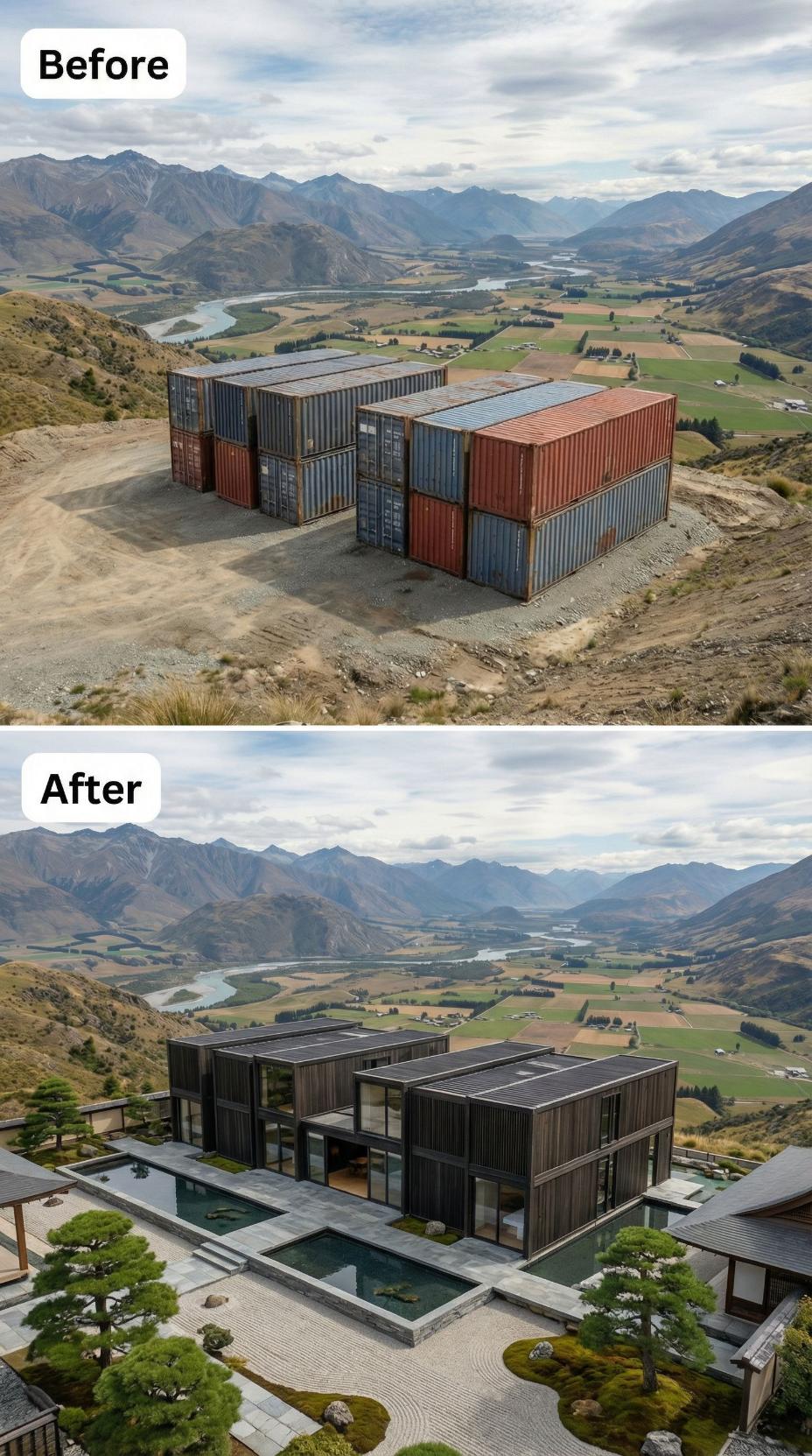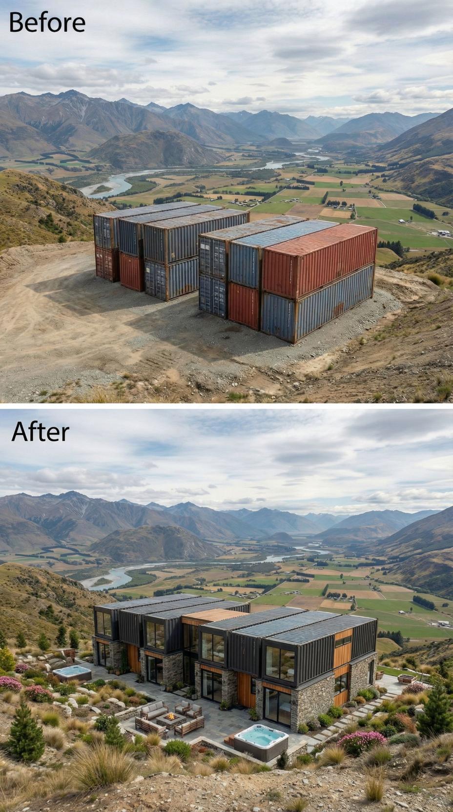 Weathered cargo containers undergo a stunning metamorphosis into sleek contemporary villas with floor-to-ceiling windows and warm corten steel cladding. The transformation adds expansive infinity pools, stone terracing, and sophisticated outdoor lounging areas that frame the dramatic mountain vistas. Modern architectural elements replace industrial features, creating seamless indoor-outdoor living spaces perfect for luxury mountain retreats.