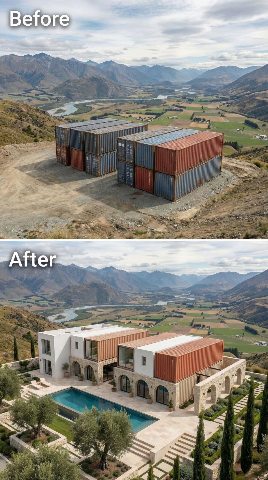 Used shipping containers disappear beneath elegant stone archways and modern extensions in this stunning Mediterranean transformation. Weathered steel boxes evolve into sophisticated living spaces featuring warm terracotta accents, expansive glass walls, and pristine white stucco facades. The dramatic makeover includes infinity pool terracing, olive tree landscaping, and seamless indoor-outdoor flow that completely reimagines industrial origins into resort-style luxury.