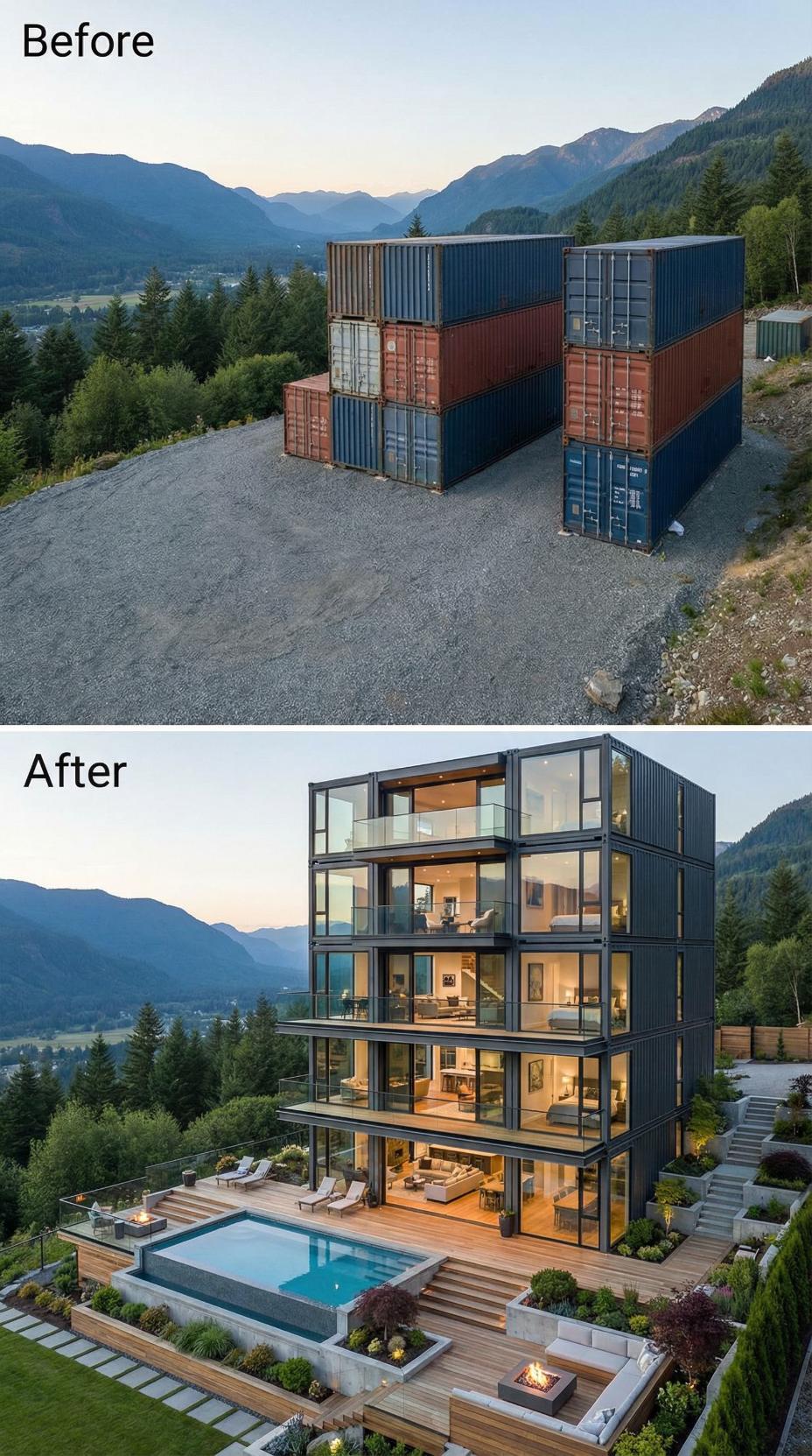 Raw industrial containers underwent a stunning metamorphosis into this sophisticated hillside residence featuring expansive glass walls and natural stone accents. Multiple levels cascade down the slope, creating distinct living zones connected by sleek outdoor terraces. The infinity pool anchors the design while floor-to-ceiling windows blur interior-exterior boundaries. Manicured landscaping and contemporary furnishings complete the luxurious transformation from humble shipping origins.