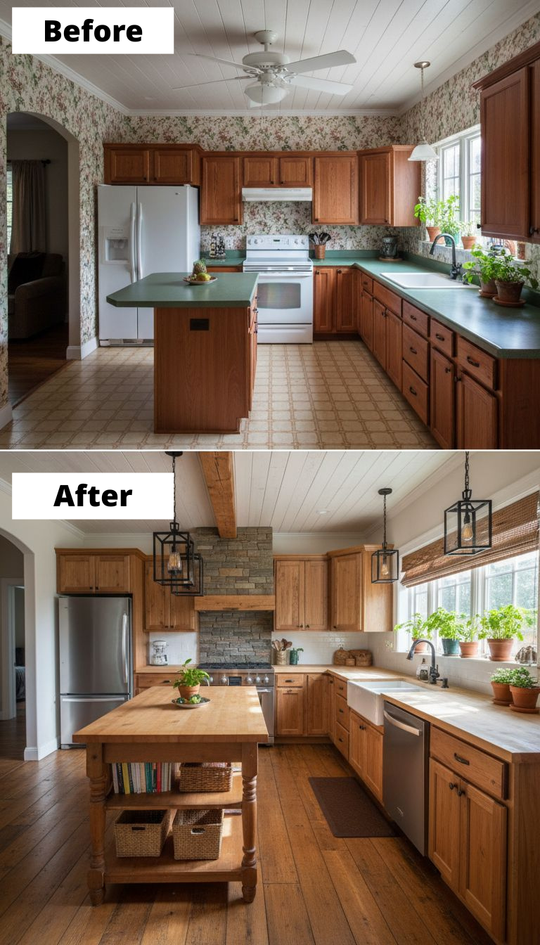 This transformation takes a wallpaper-heavy 1990s kitchen and turns it into a warm, rustic farmhouse space filled with natural light and texture. Dated green countertops and vinyl flooring are replaced with butcher block surfaces, hardwood floors, and a stone focal wall that adds depth and character. Exposed beams, lantern pendants, and cohesive wood tones create a relaxed, timeless atmosphere. The result feels airy, grounded, and inviting, blending classic farmhouse warmth with modern functionality.