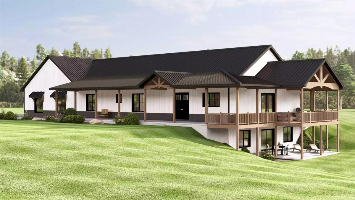 A barndominium ranch that packs 2,856 square feet, three bedrooms, three-and-a-half bathrooms, and a four-car garage into a rectangular footprint. Step inside the front door and a cathedral vaulted ceiling spans across the entire great room, from the kitchen by the entry, over the dining area, and to the living space with a corner fireplace and a wet bar in back.