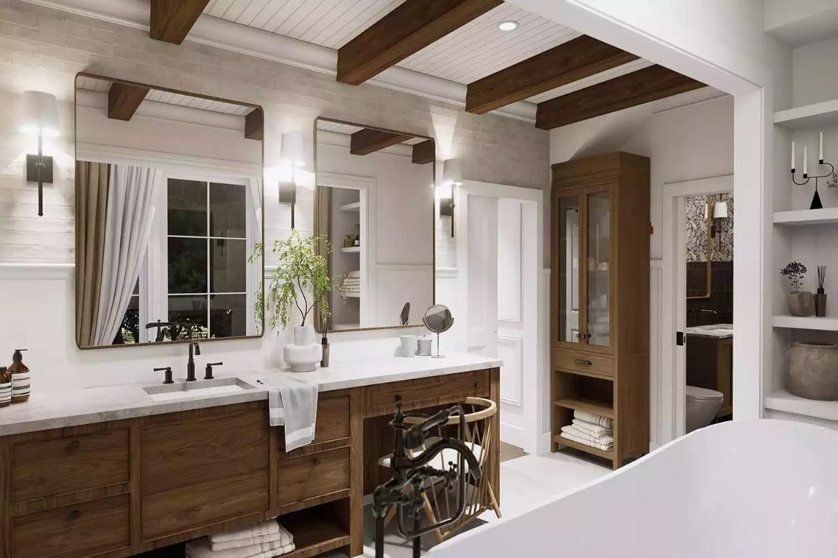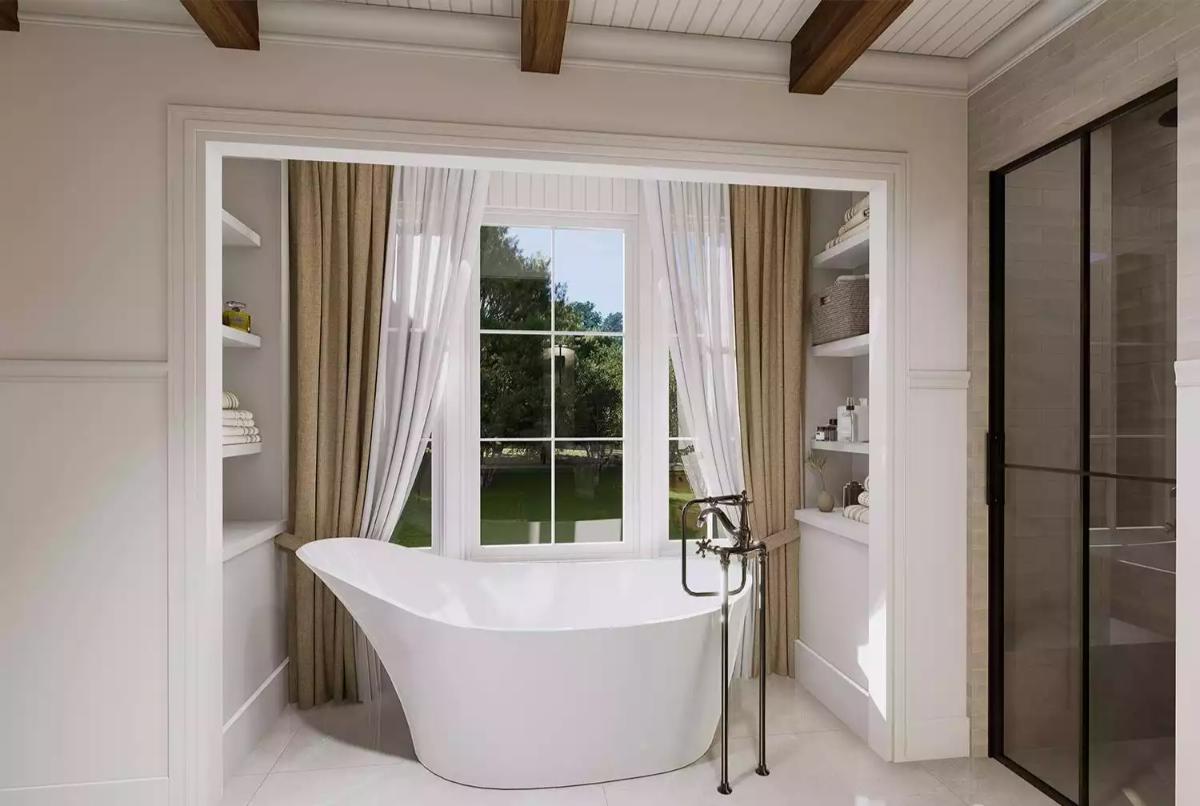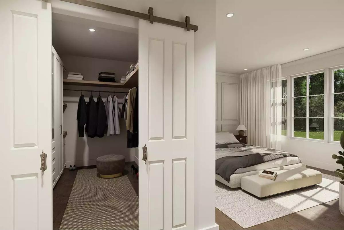 The primary suite is conveniently located on the main level and includes a private sitting area, his and hers walk-in closets, and a bath with a separate tub and shower. Split bedroom placement provides added privacy while maintaining easy flow throughout the home.