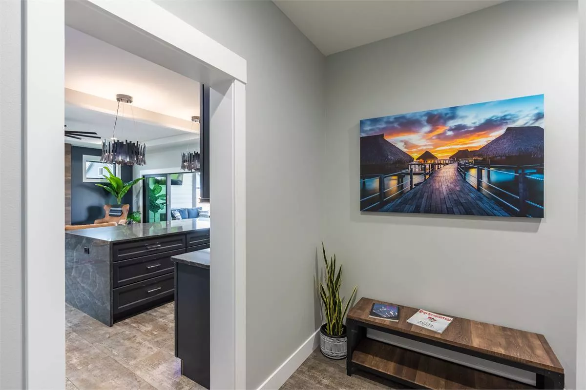 To your left sits the formal dining room which is totally open to the great room and the island kitchen, along with its access to the covered patio nearby. To your right you’ll find a large hallway that leads to the garage, laundry room, and even the master suite which is fully private.
