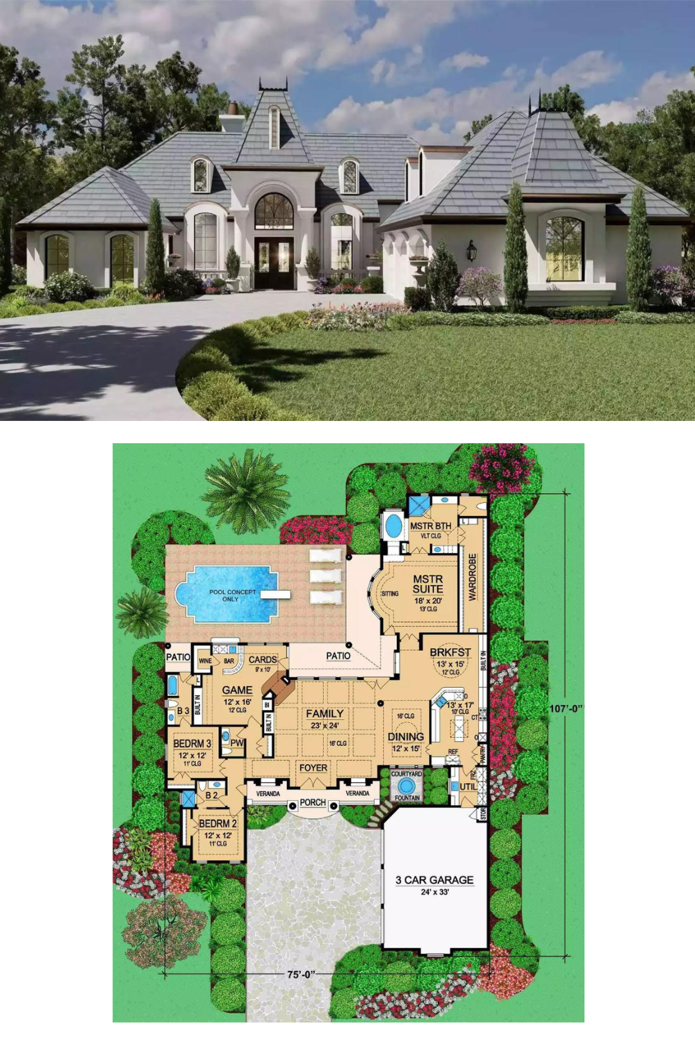 The master suite occupies the right rear corner with direct patio access and a sitting area. Three bedrooms cluster on the left with shared baths. A game room and bar anchor the opposite corner near a shaded patio. The family room opens to a pool deck. A courtyard fountain greets visitors at the entry. The three-car garage enters from the side, keeping the front elevation clean and preserving curb appeal.