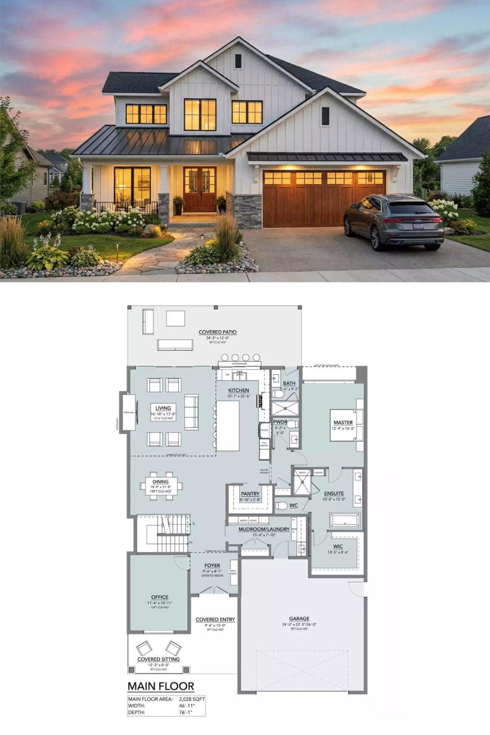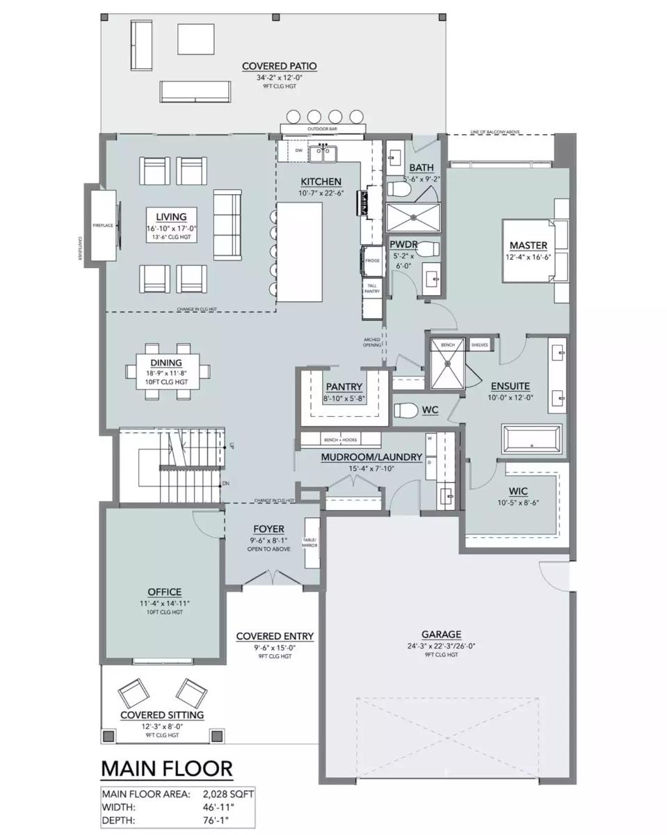 Vaulted ceilings and a striking two-story volume add brightness and a welcome sense of space. The main-floor primary suite offers a double vanity, a separate tub and shower, and a comfortable walk-in closet.