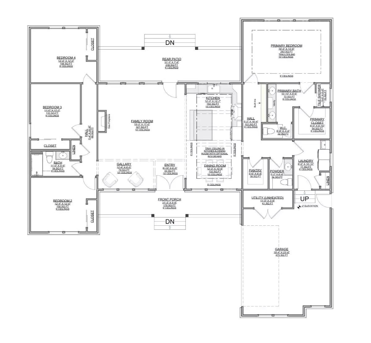 With 2,230 square feet, this single-level plan uses its space wisely to create an inviting layout centered around comfortable family living. The kitchen brings together an L-shaped design, a peninsula eating bar, a butlerโs pantry, and a large island that opens easily into the family room.