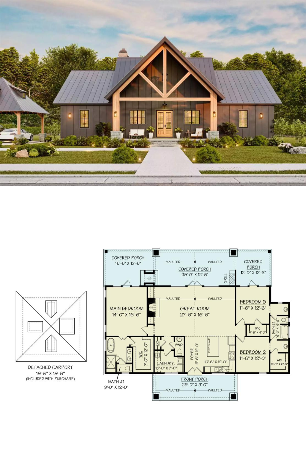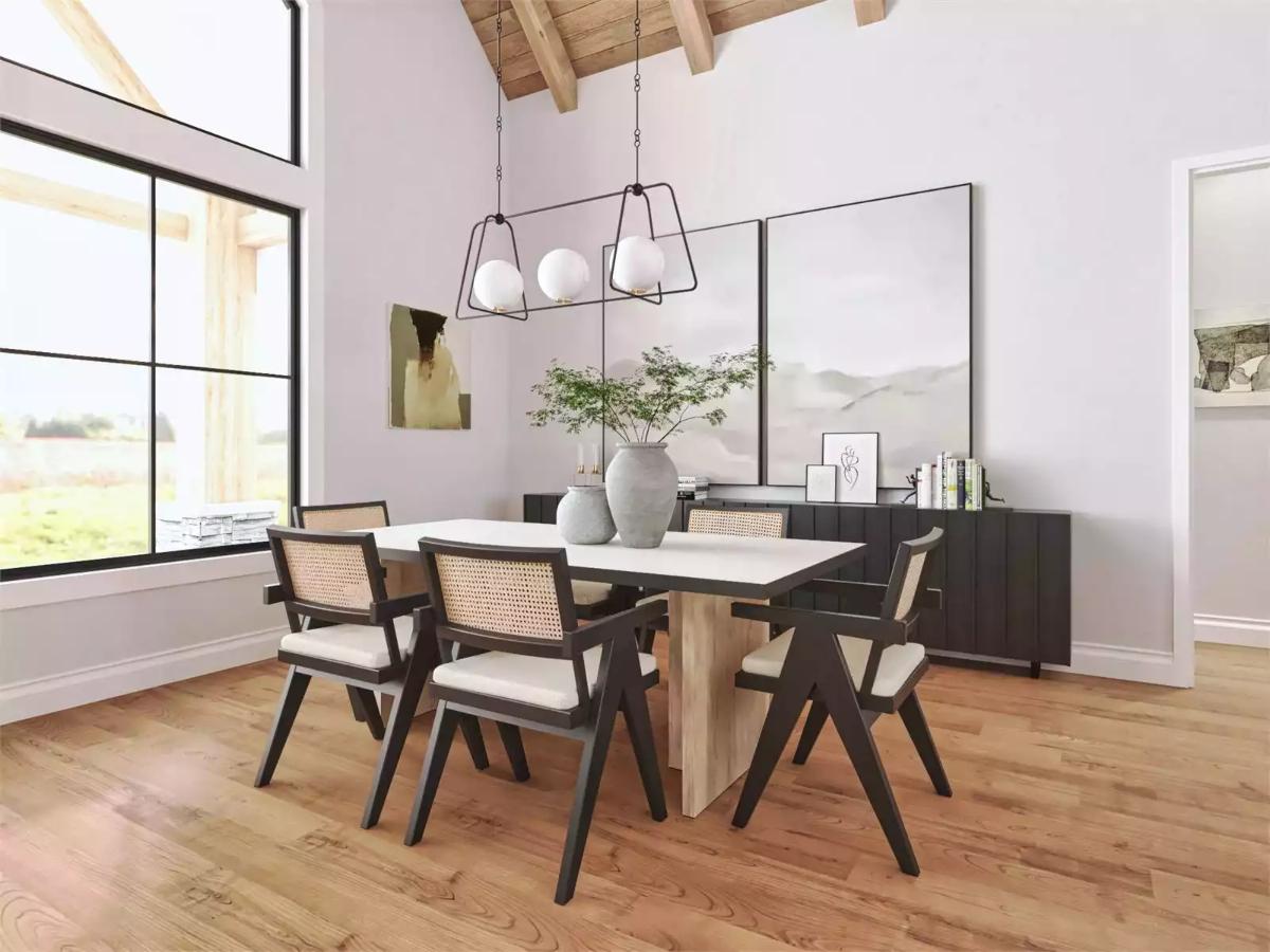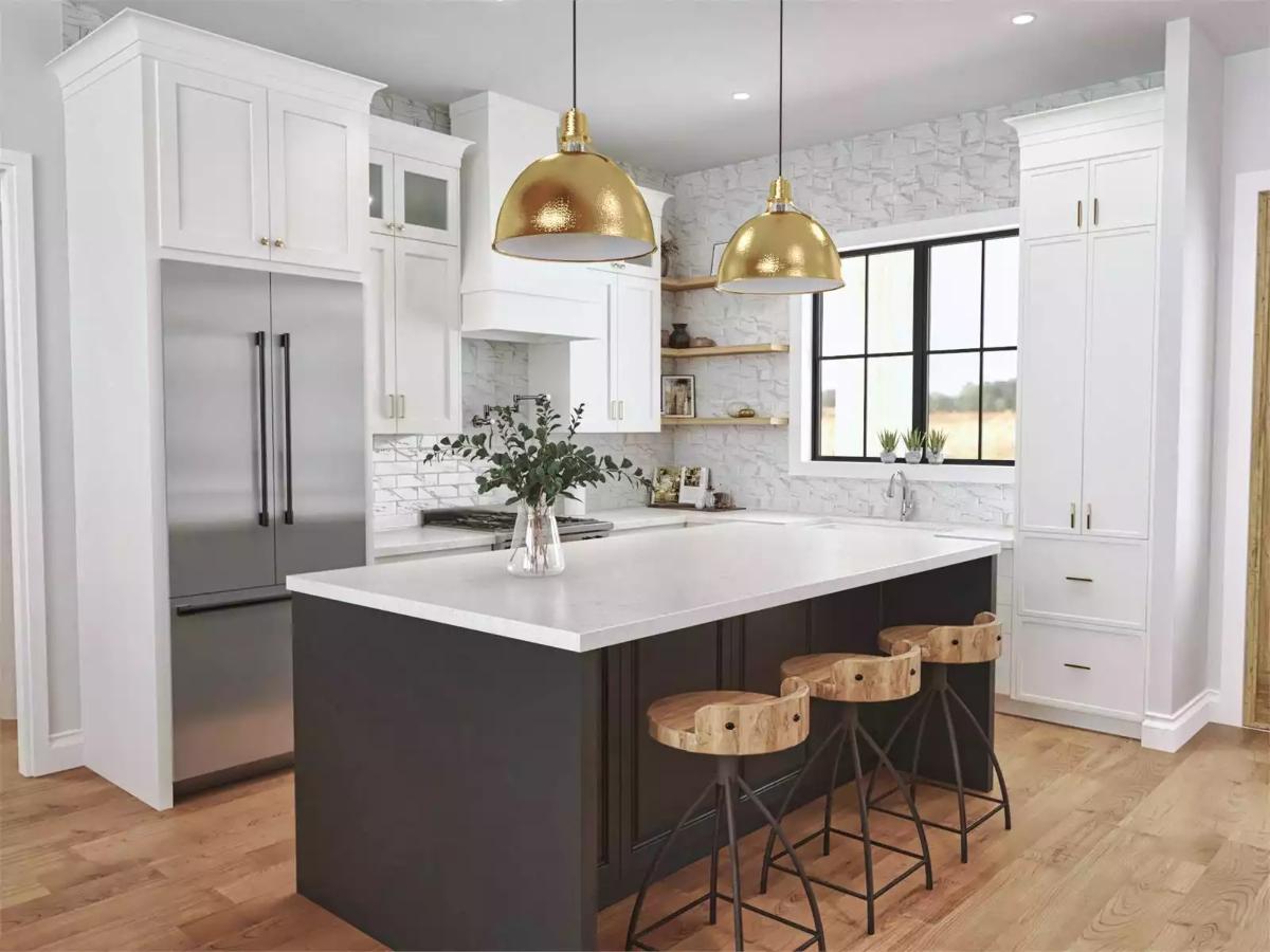 Step into the captivating world of Haystack, a stunning 1,849 square foot modern farmhouse that effortlessly blends style with the charm of country living. As you enter through the foyer, a chic L-shaped kitchen beckons to the right, featuring a spacious island and ample counter space.