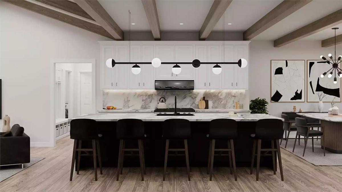 The primary bedroom sits on the main floor with a walk-in closet and a double-vanity bath, while the split-bedroom layout adds privacy for the additional bedrooms. A home office and a well-organized mudroom support busy days and quiet work time.