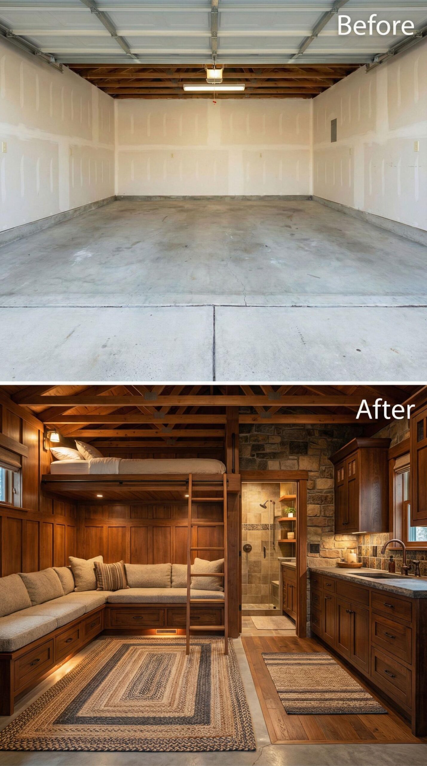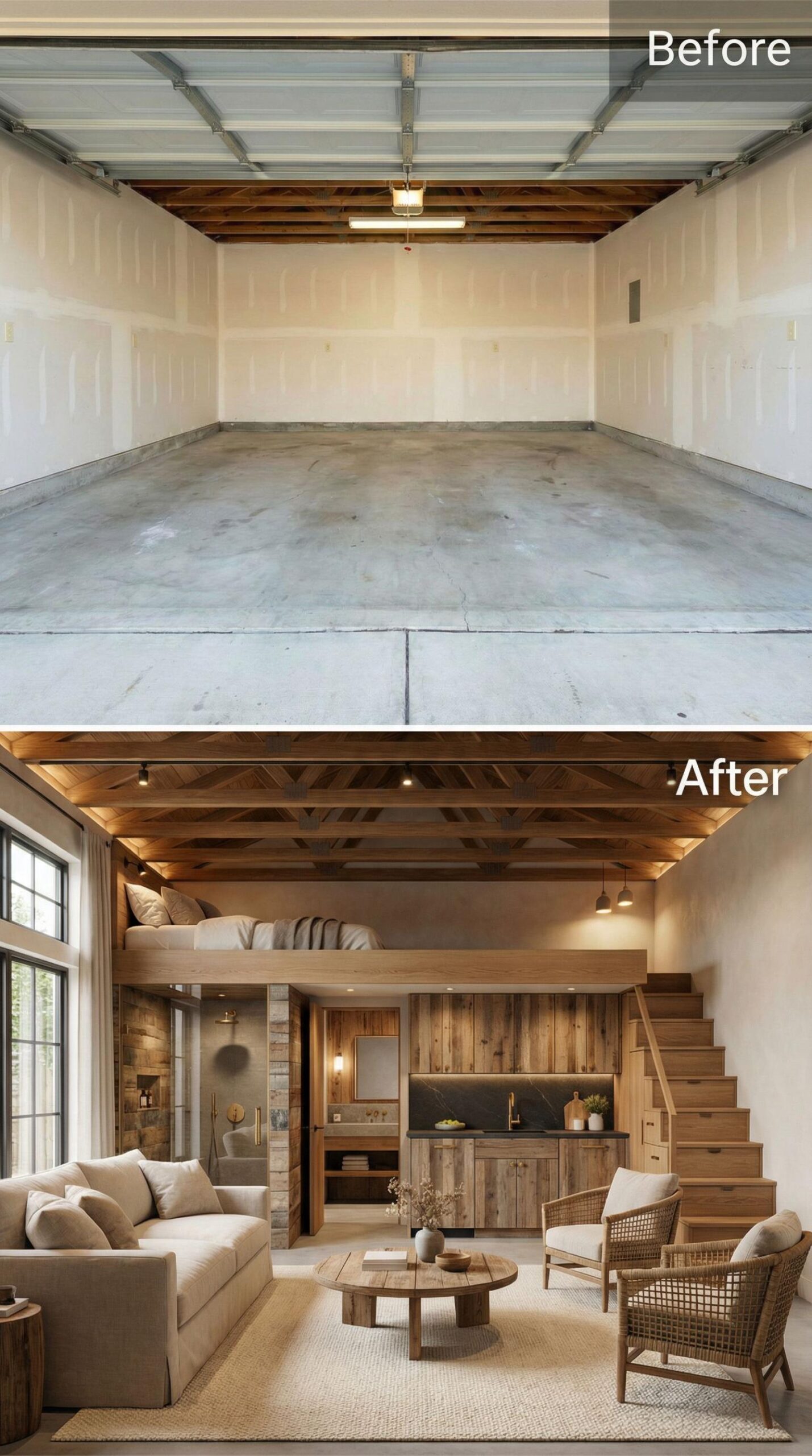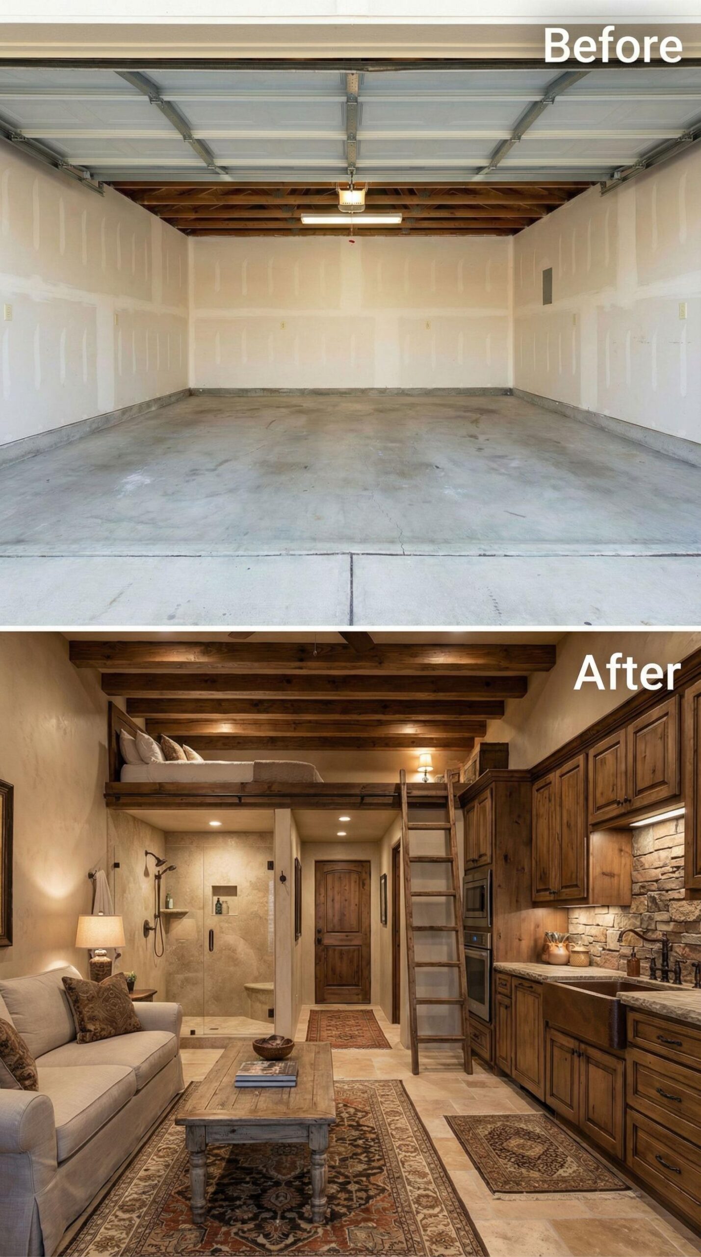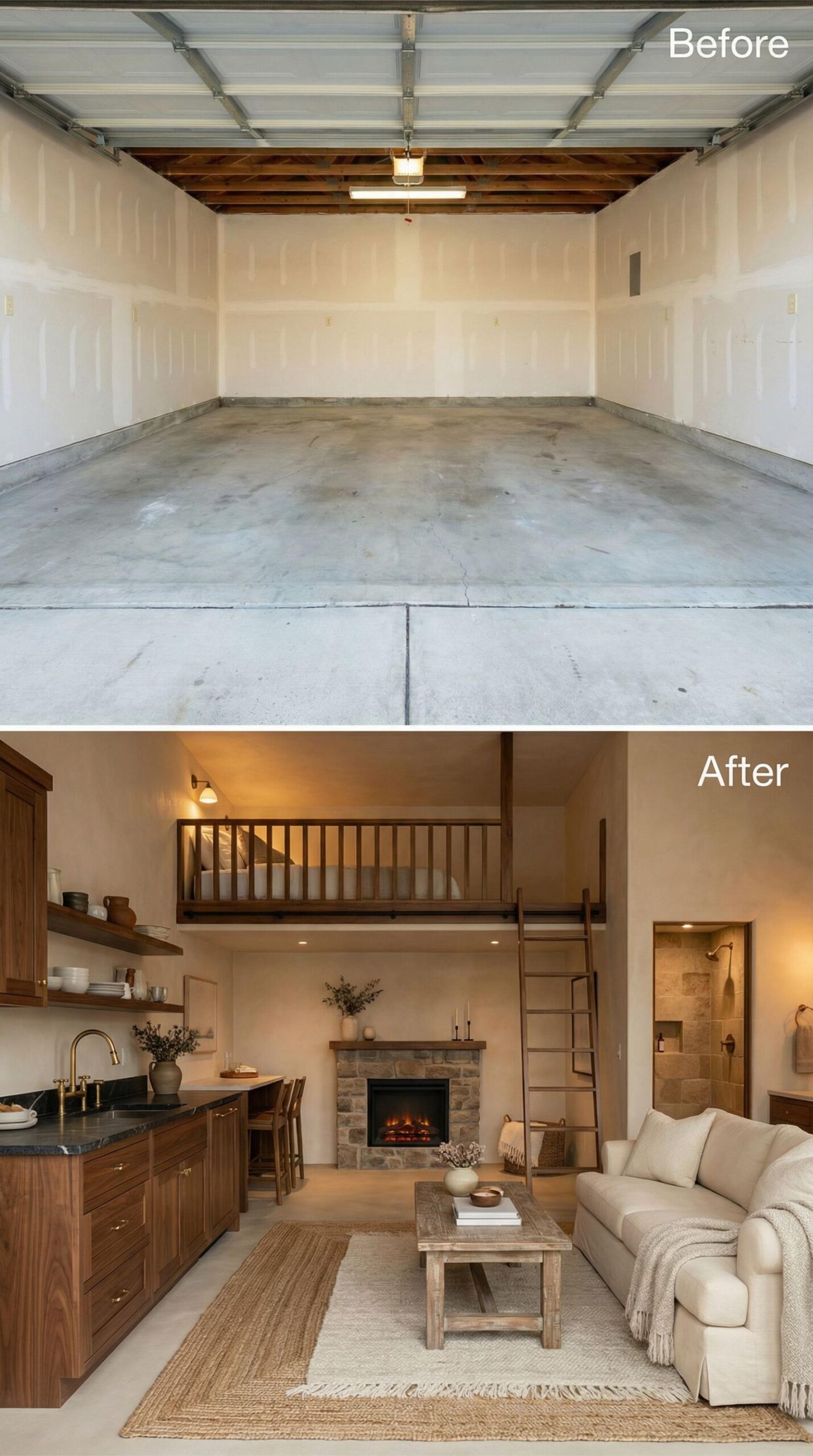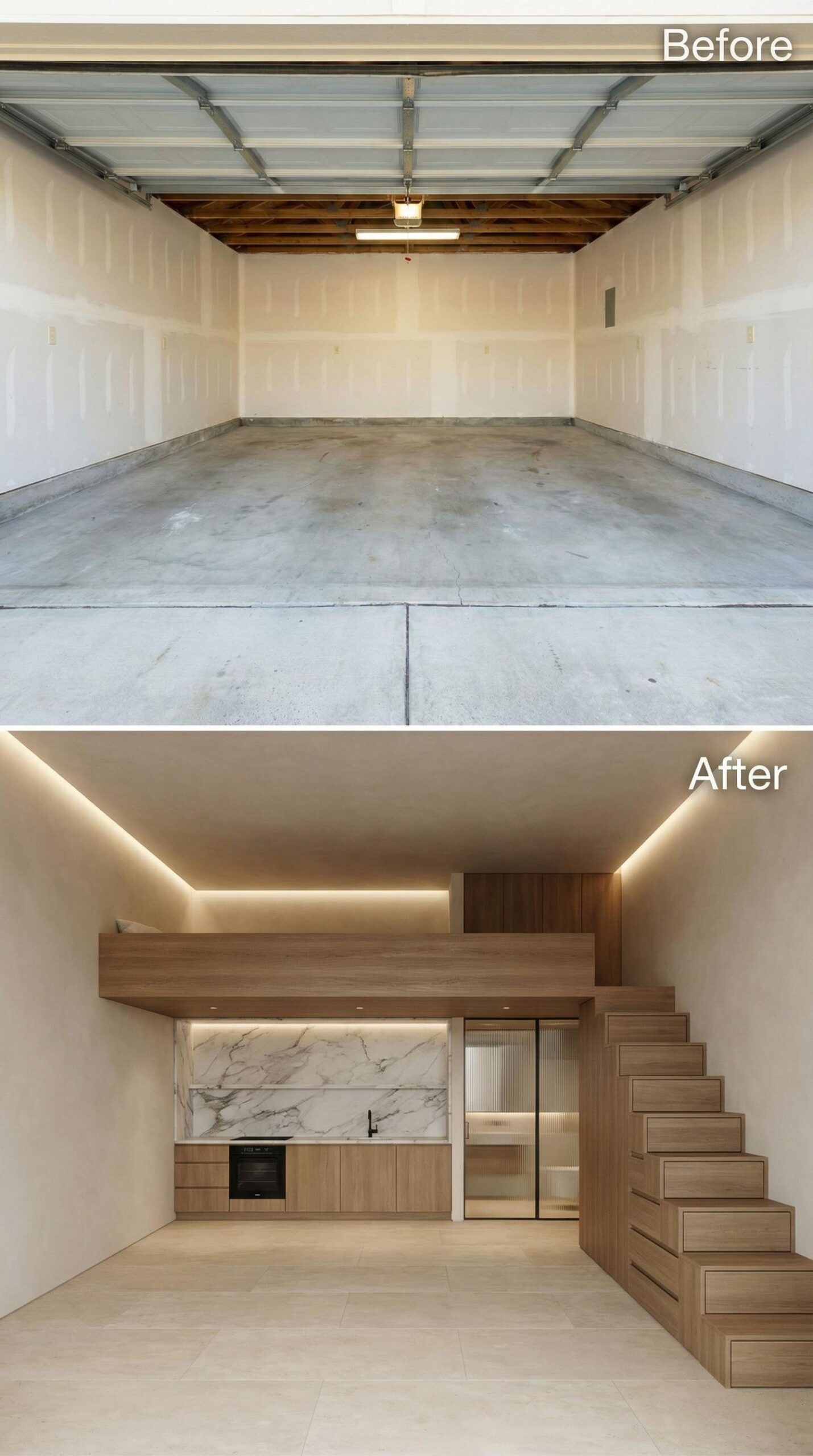 Once the kids moved out, we were left with a two-bay garage we barely used — and no clear idea how to turn it into something better. We liked the idea of converting it into an income-producing apartment, but had no clue how to design the layout, where the kitchen should go, or whether a sleeping loft would even work. So instead of guessing, we turned to AI. These 33 before-and-after garage transformations show what’s possible when the same space is reimagined in dozens of different ways.