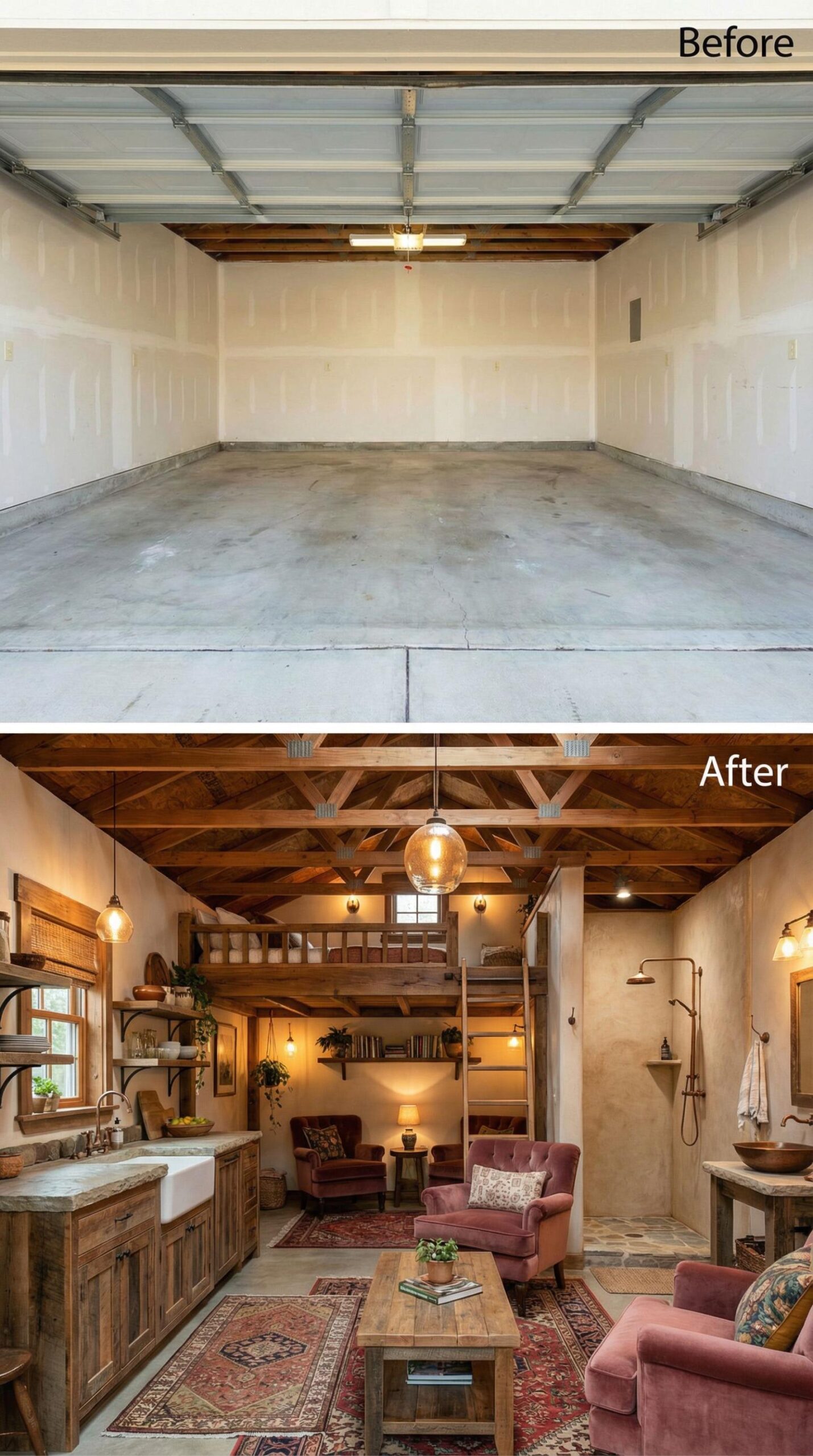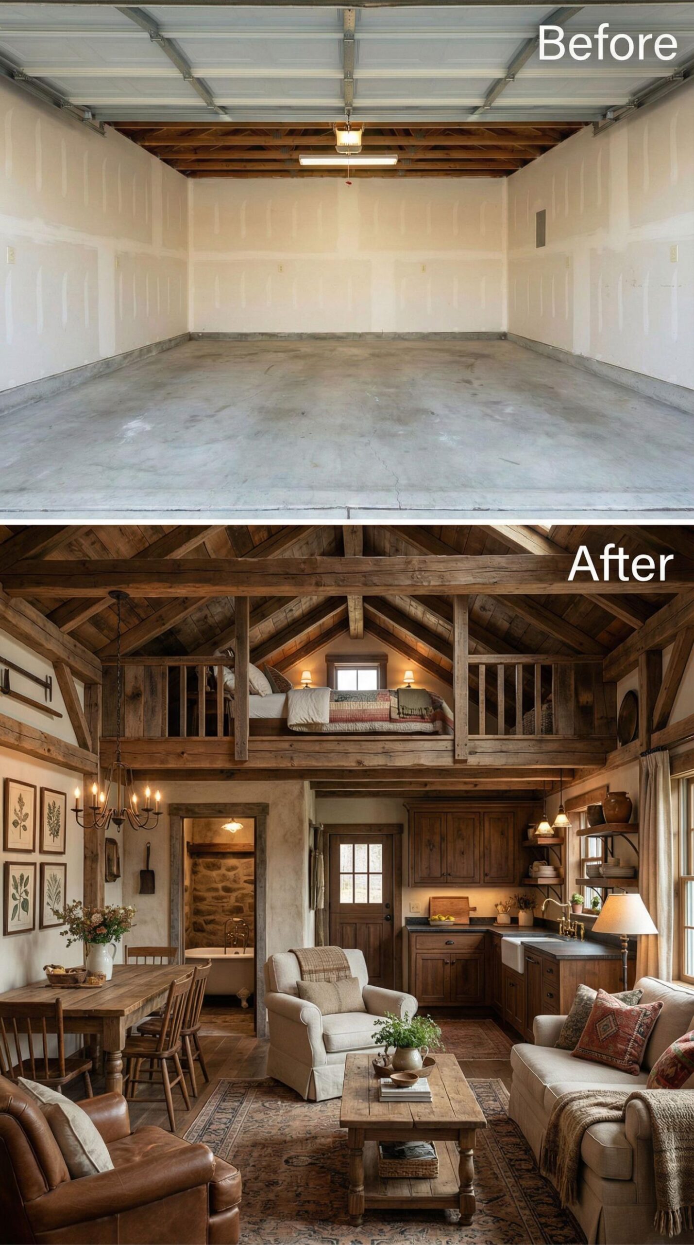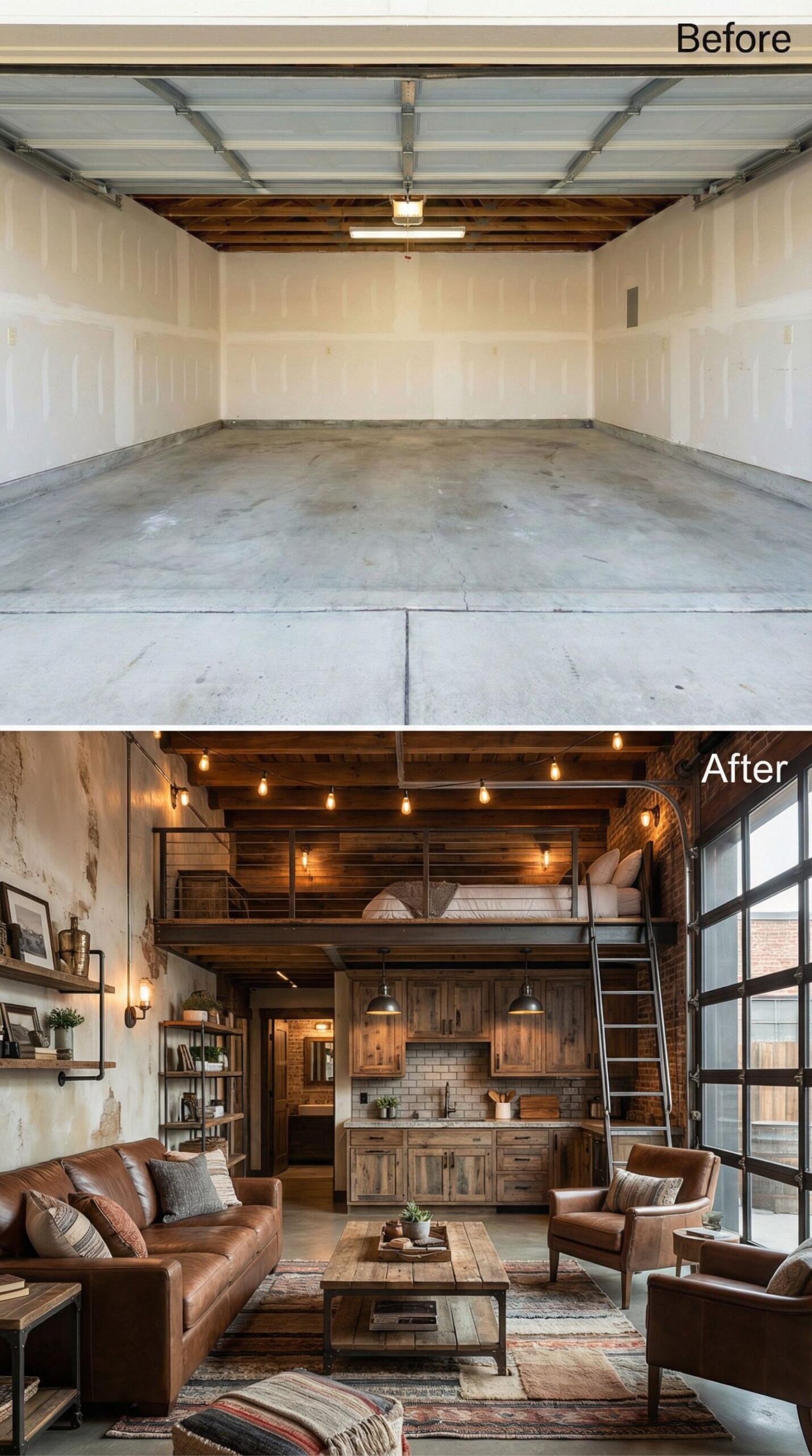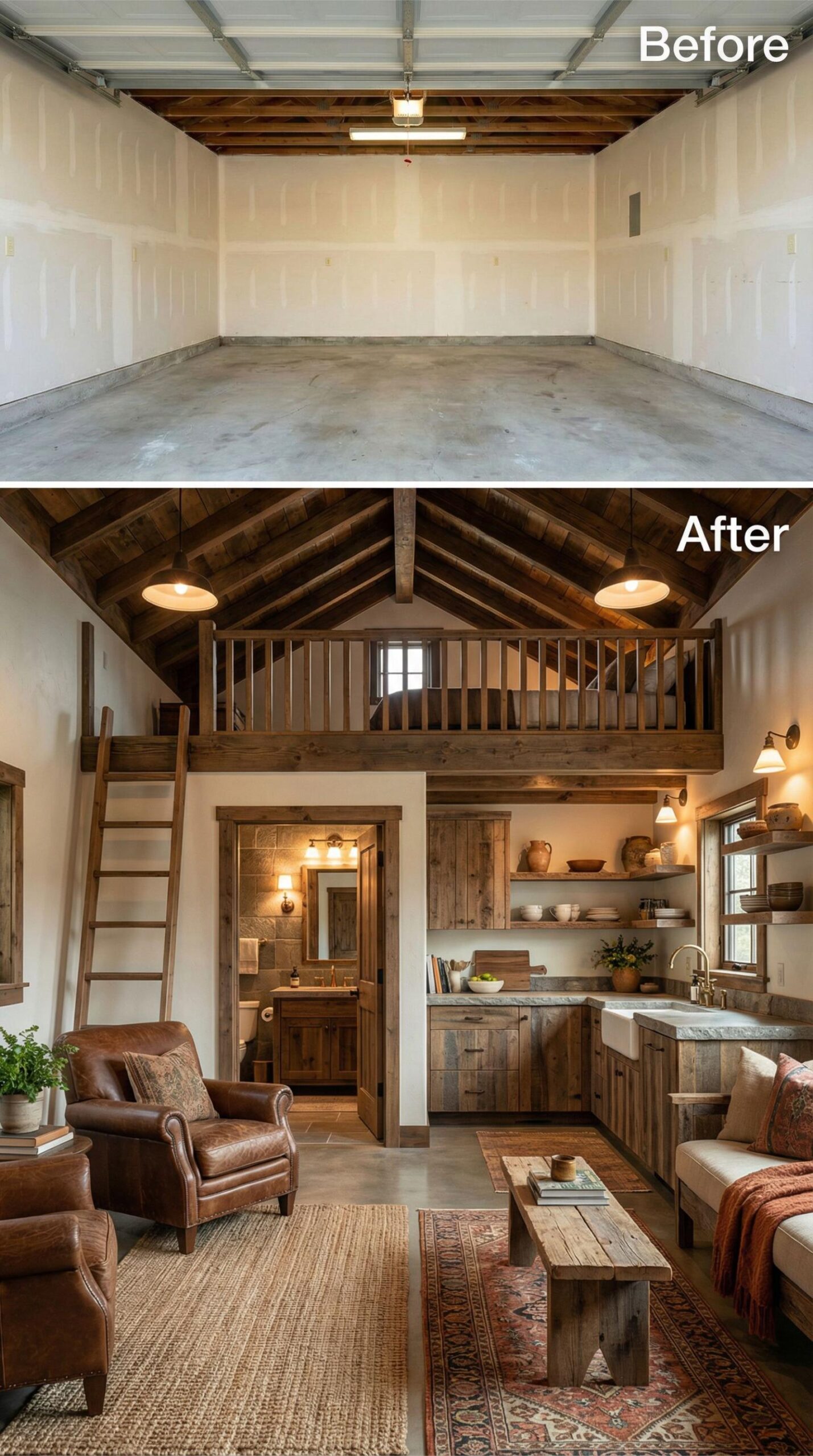 Rustic Loft Living Transforms Two-Bay Garage into Cozy Retreat