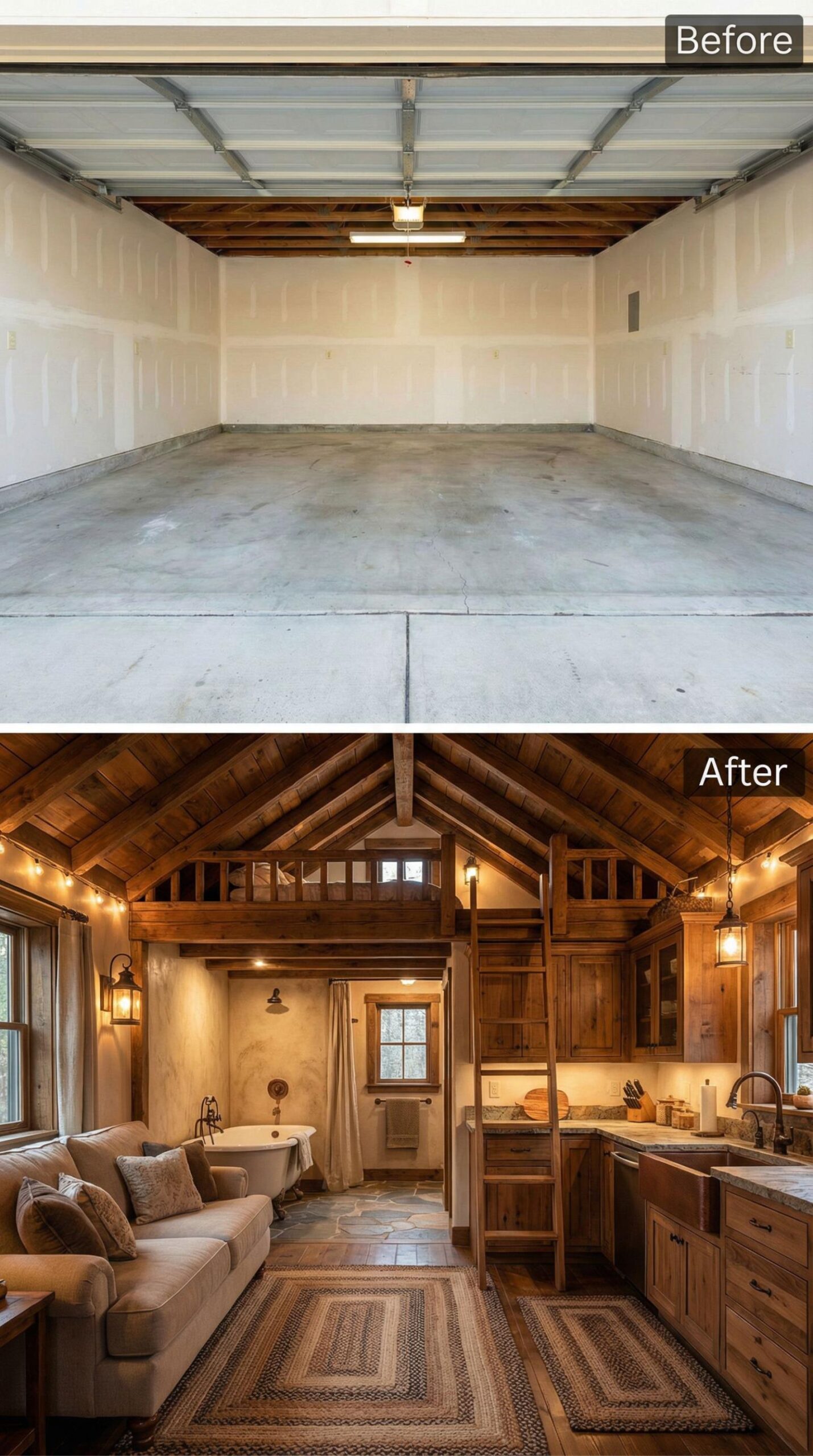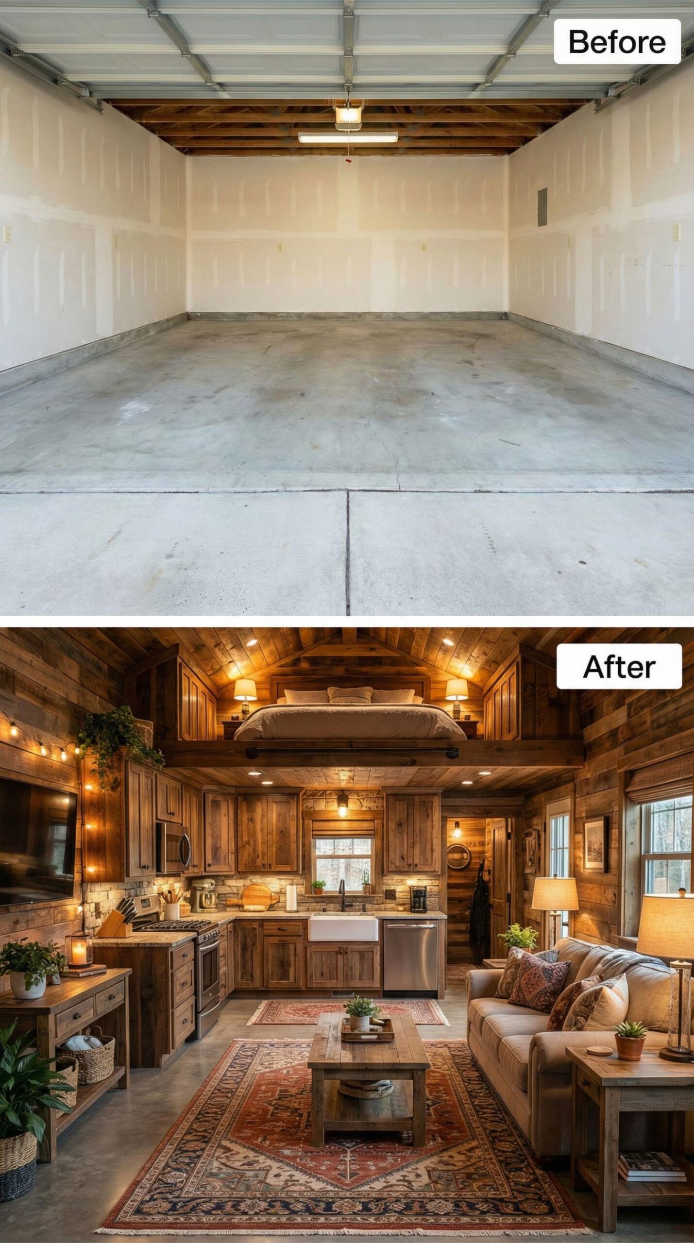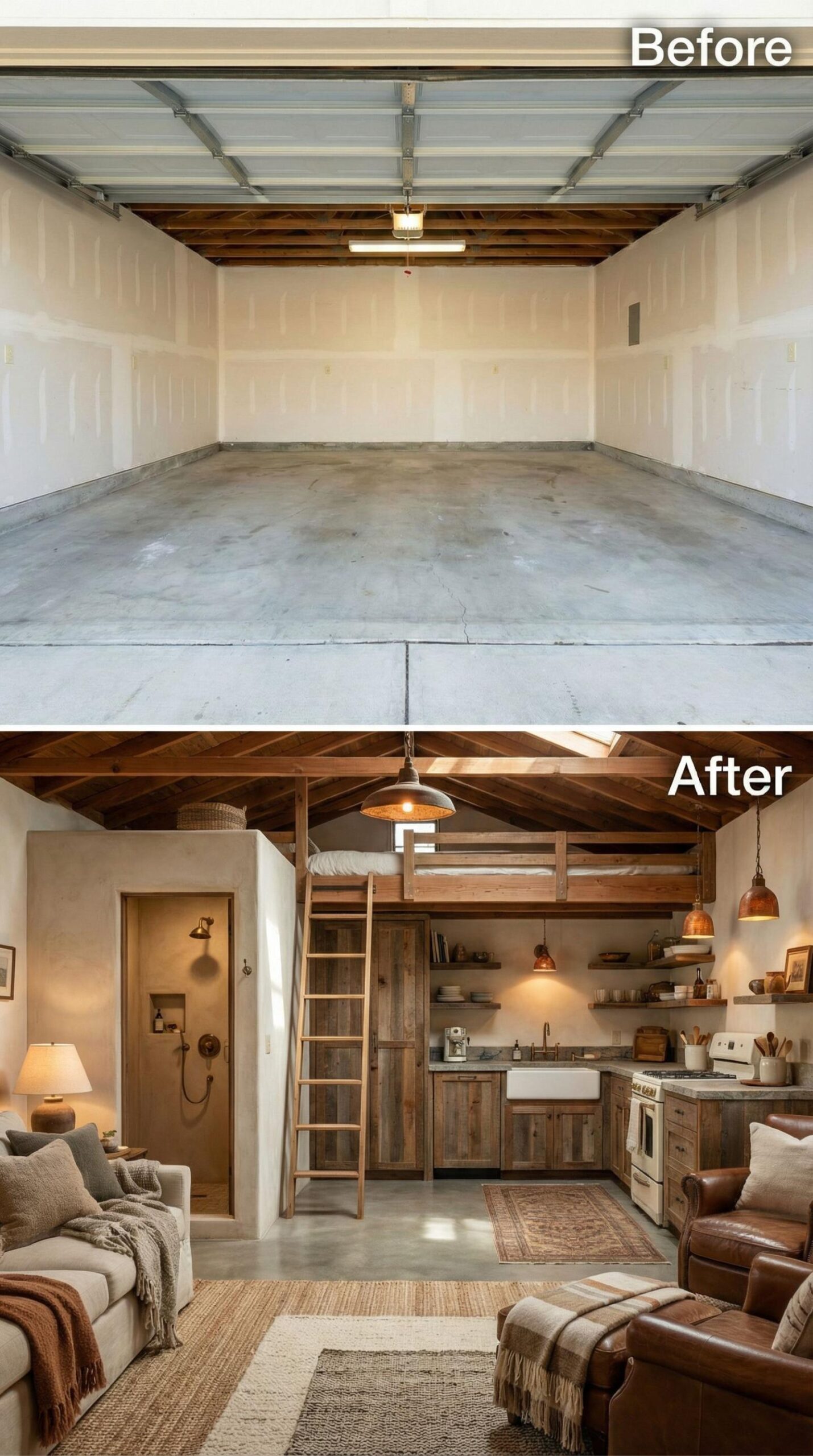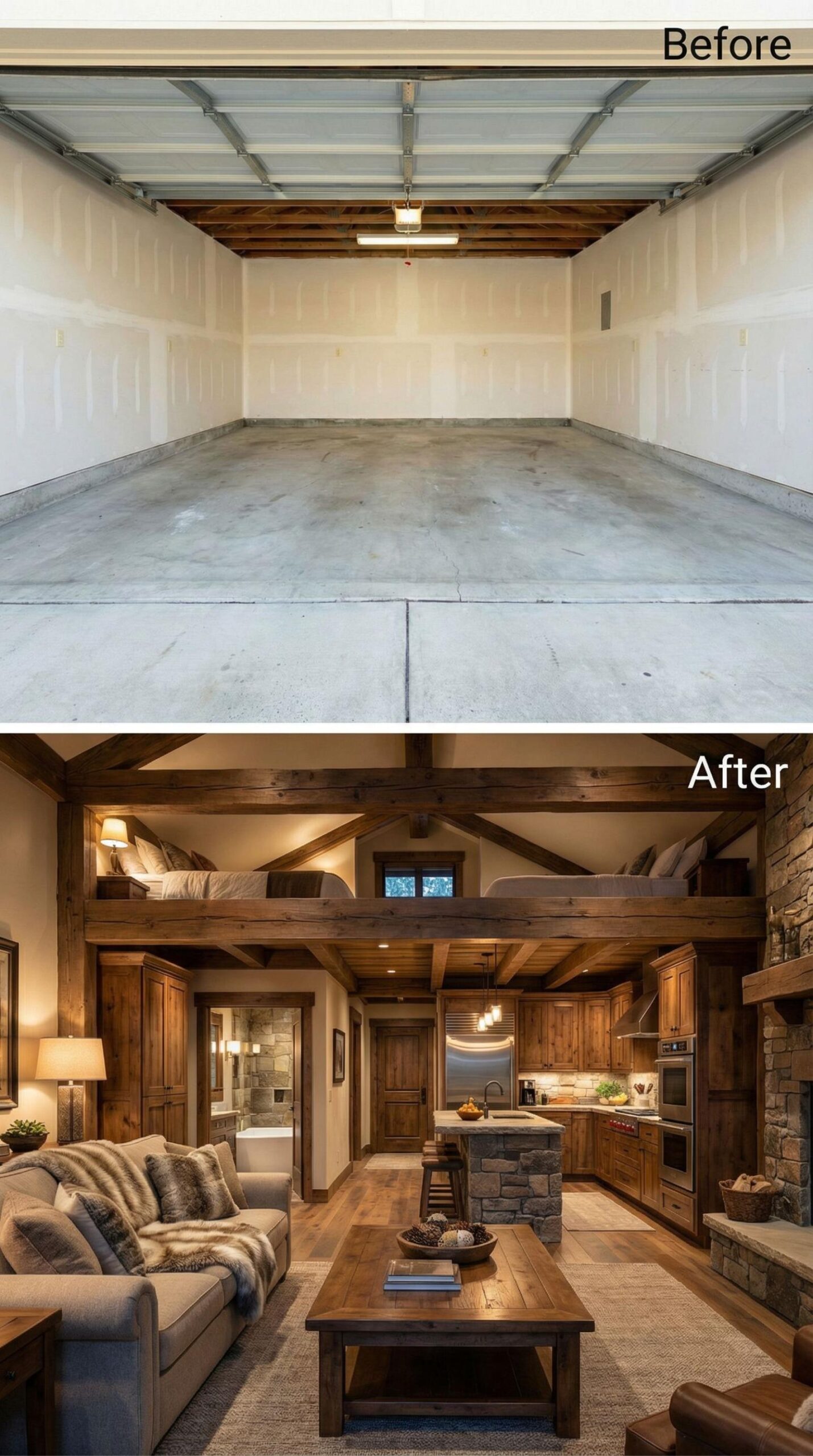 Rustic Loft Living Transforms Two-Bay Garage into Cozy Retreat