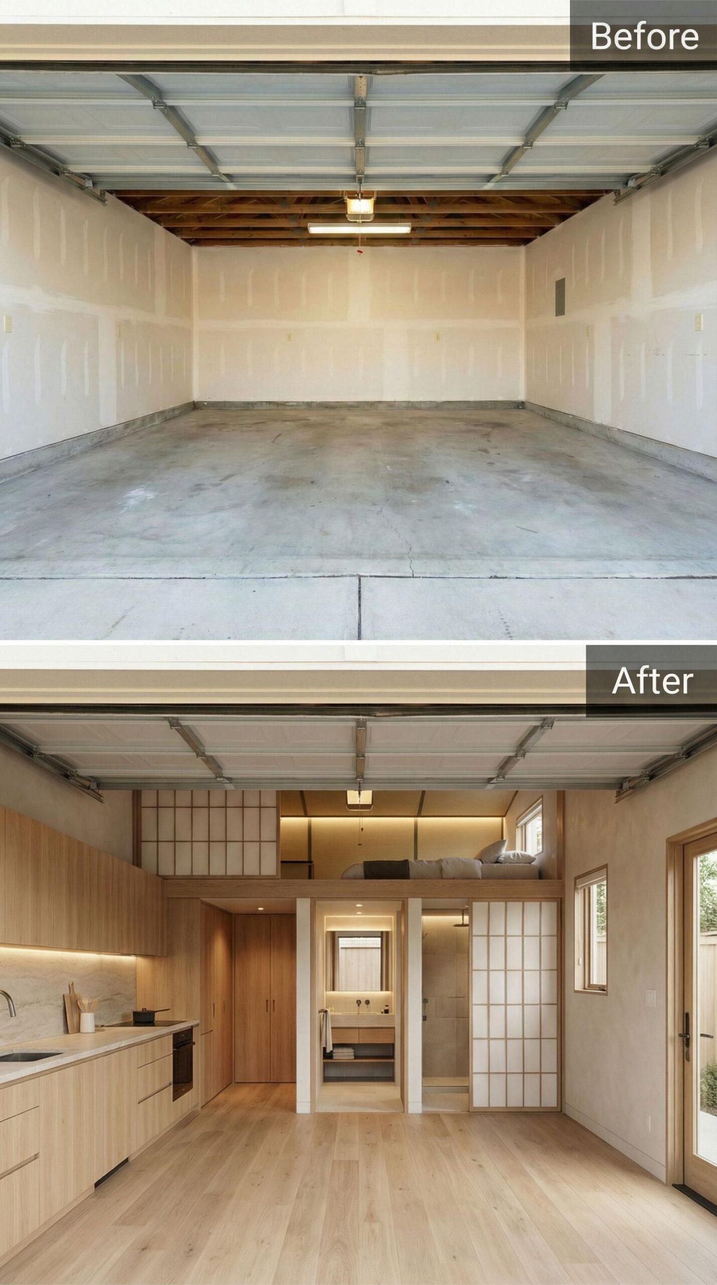 From Two-Bay Garage to Japanese-Inspired Micro Apartment with Loft Bedroom