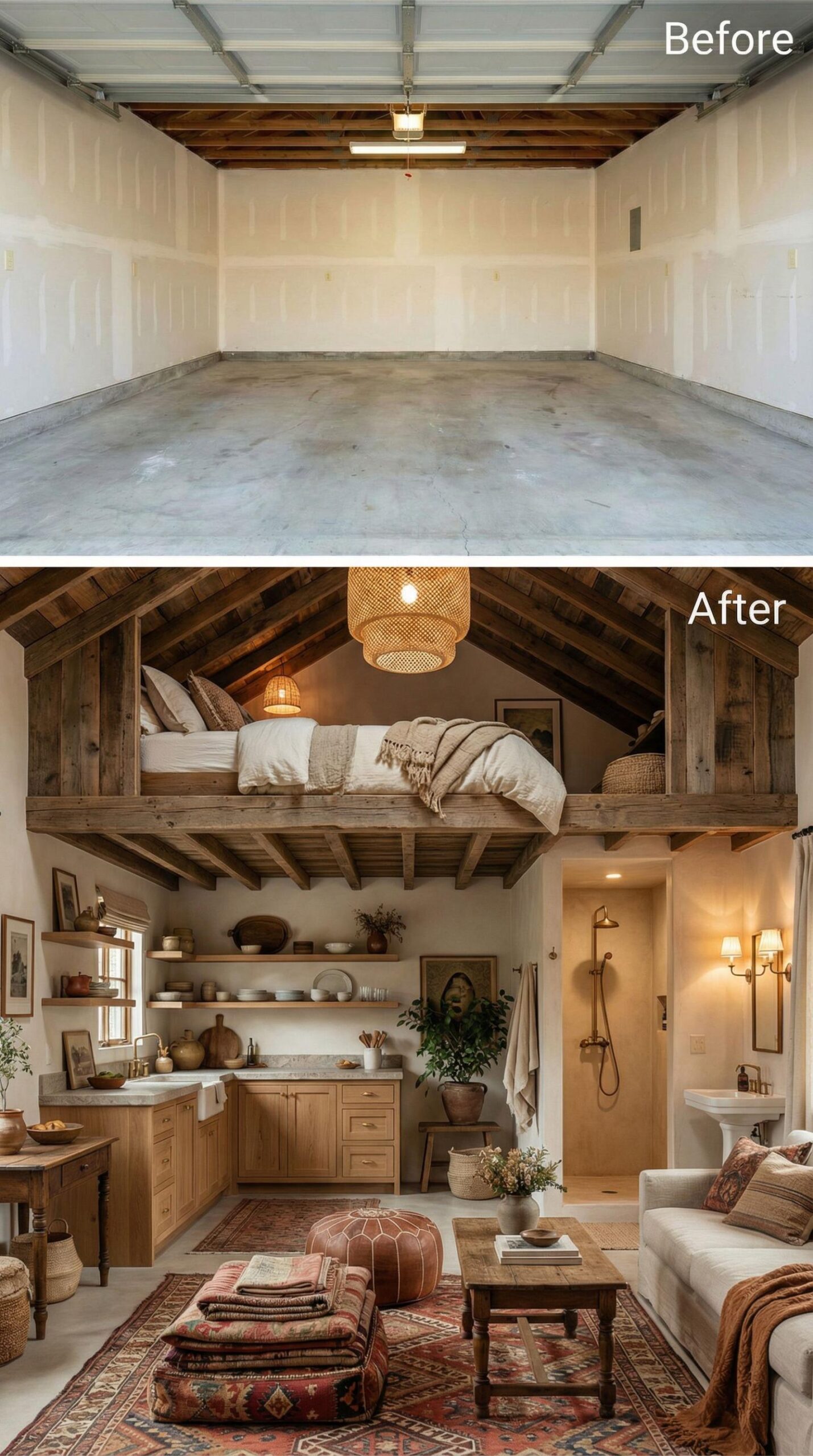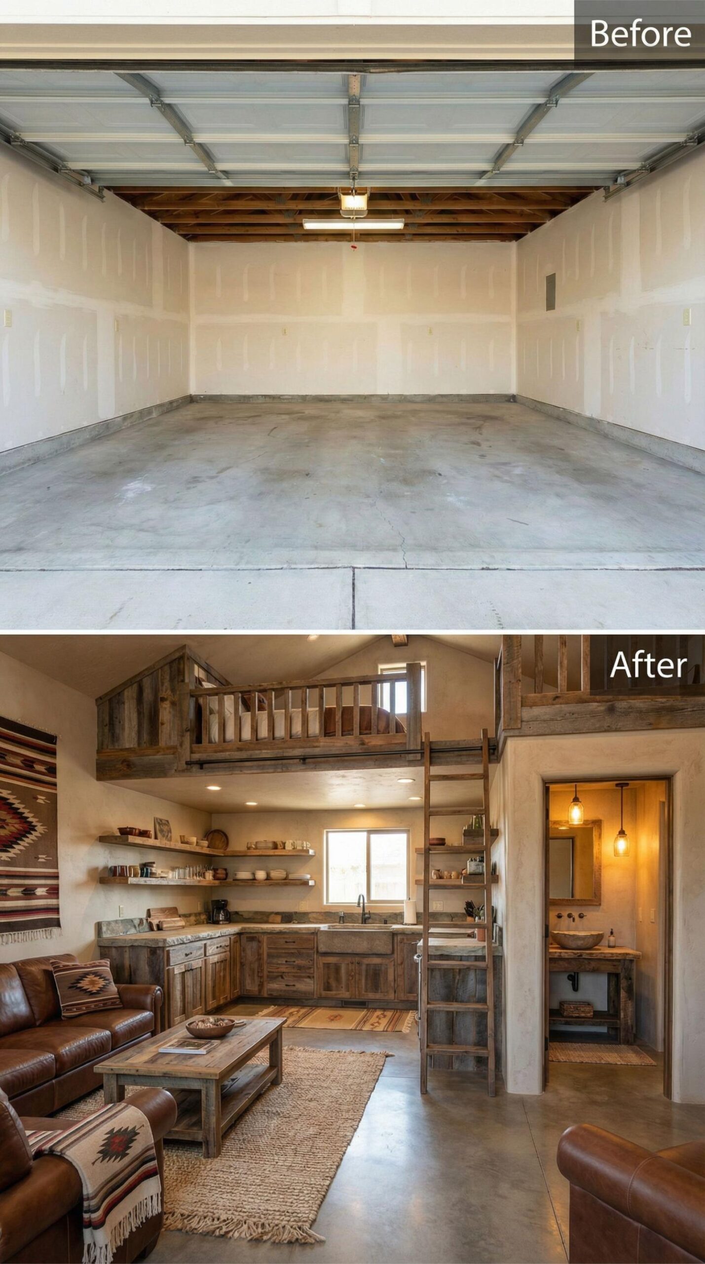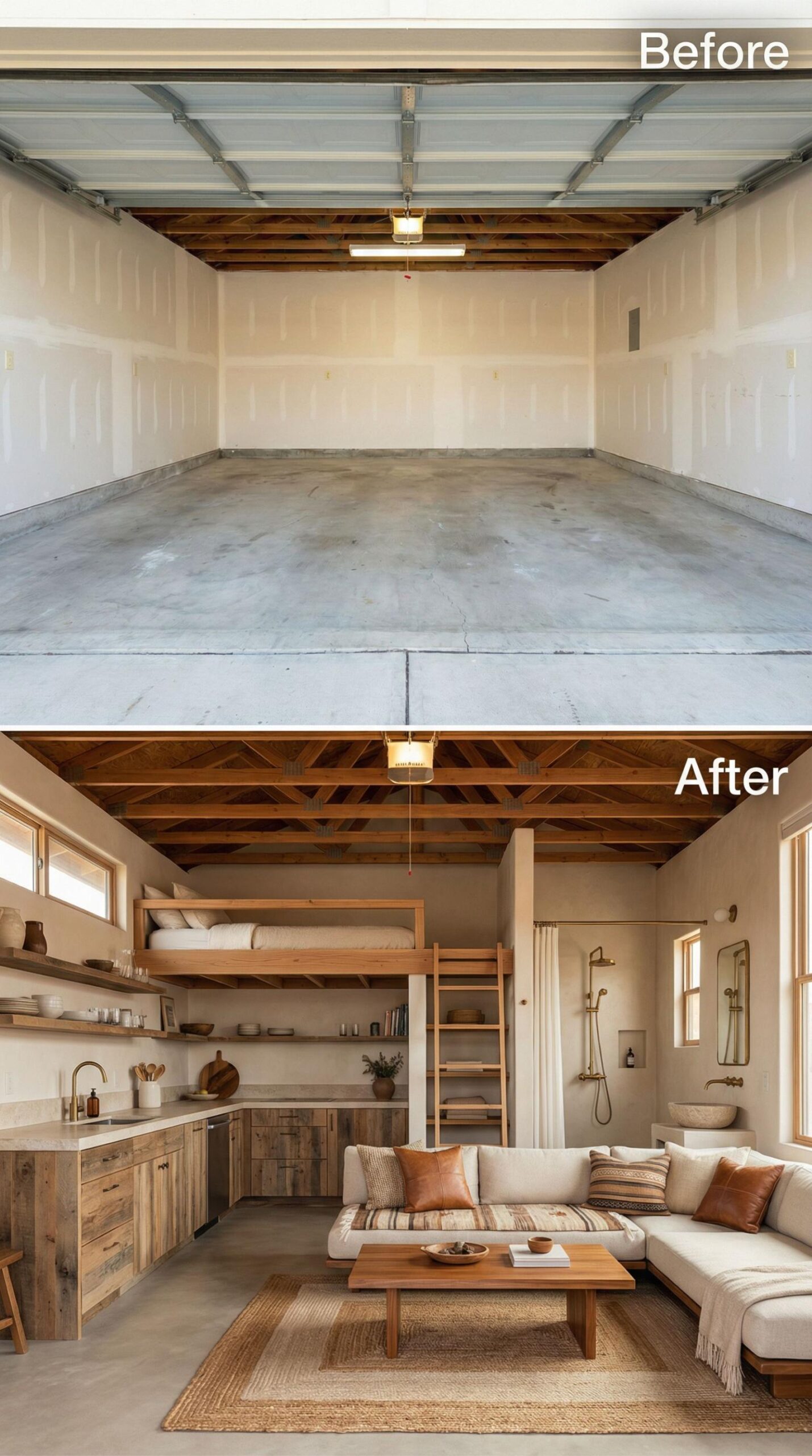 From Two-Bay Garage to Rustic Loft with Kitchen and Living Space