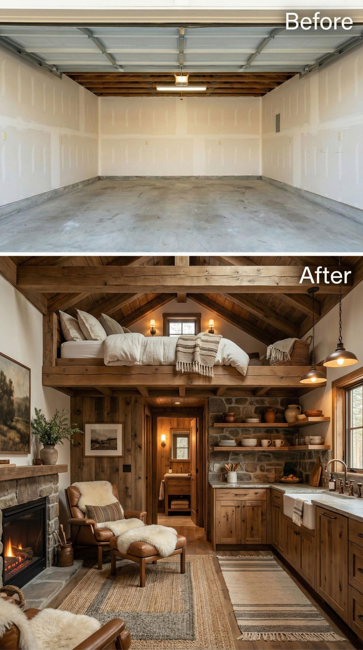 From Two-Bay Garage to Rustic Cabin Loft with Stone Fireplace